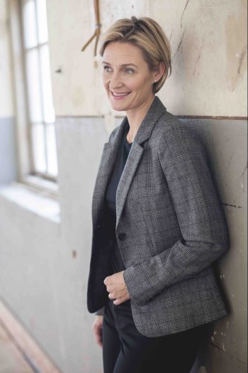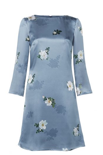 Maja dress is sewn in the finest Italian silk, printed with our own print of wild honey roses on a shimmering blue background. The dress has boatneck three-quarter sleeves.
