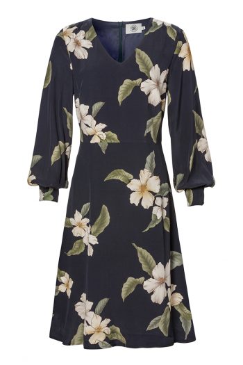 Vackra Madeleine klänning i ett vackert storblommigt print på en mörkblå botten i den mjukaste viskos. Klänningen är v-ringad med hellång ärm och har ett mjukt foder i cupro.