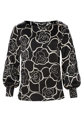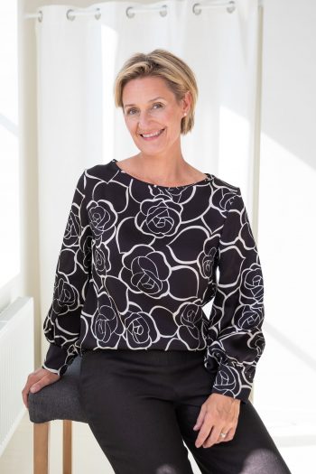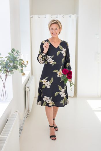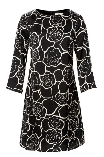 Maja klänning här i ett modernt print på en svart botten. Tillverkad i vacker skimrande viskos med ett mjukt foder i cupro. Klänningen går strax ovan knäet, har en båtformad hals och en trekvarts ärm.