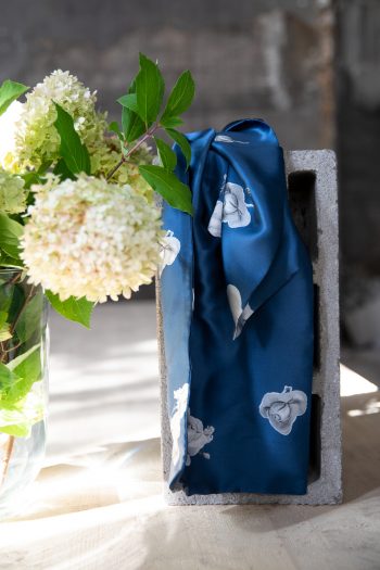 Dubbelsydd sidenscarf i 100% Italiensk siden. Här med en underbar midnattsblå färg och gråvita rosor som print.