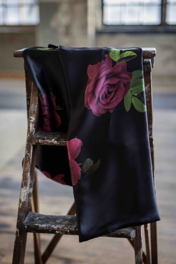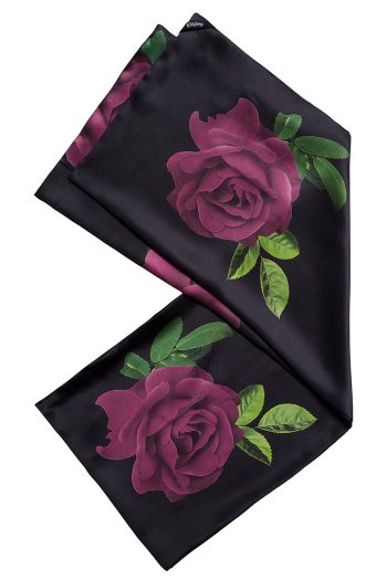 Dubbelsydd sidenscarf i 100% Italiensk siden. Stora vackra vinröda rosor på en svart skimrande botten.