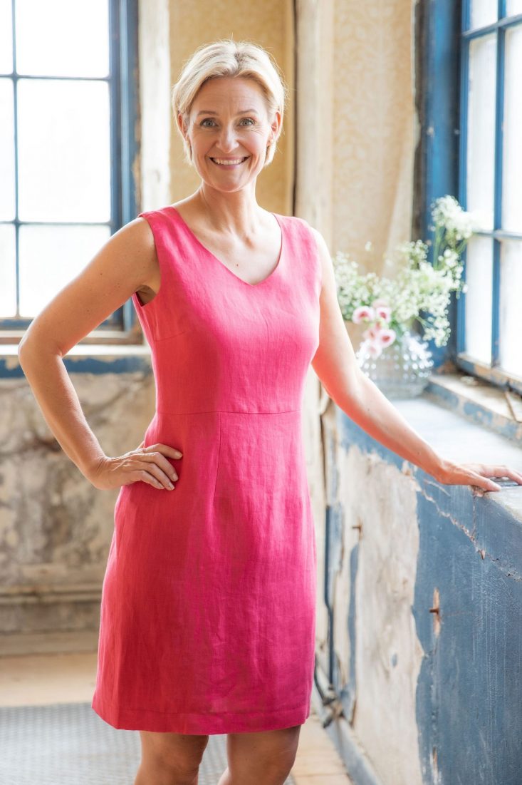 Alice klänning korall i 100% lin är en av våra absoluta favoriter. Lätt v-ringad, utan ärm, för en somrig look.