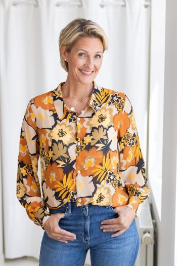 Luftiga, härliga Paula sidenblus med lång ärm och rundad hals. Blusen har en rynkad hals och ärmslut med nätt resår. Livet är en rakare modell och har ett tunt vackert foder i cupro. Halsen mitt bak knäpps med en pärlemorknapp.