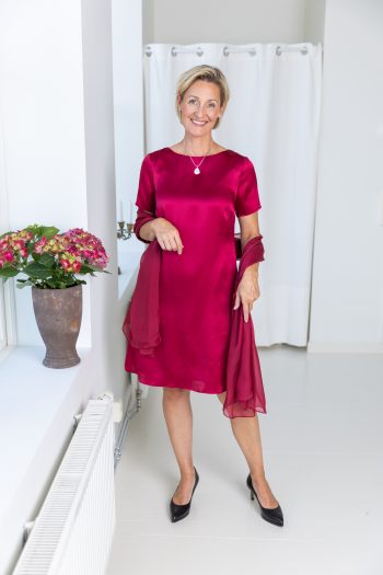 Aliana klänning röd är en vacker a-linjeformad klänning med ärm och ett mjukt foder i cupro. Denna ljuvliga klänning är sydd i finaste siden satin och har en dragkedja mitt bak.