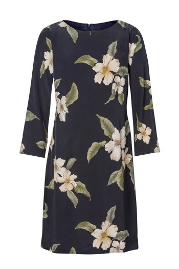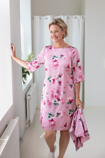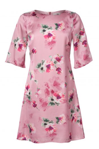 Vår älskade Maja klänning här i vårt egna hibiskus print på en vacker rosa botten. Tillverkad i skimrande Italiensk siden och med ett foder i cupro. Klänningen är a-linjeformad, har båtformad hals och har en lite vidare ärm som slutar vid armbåge.