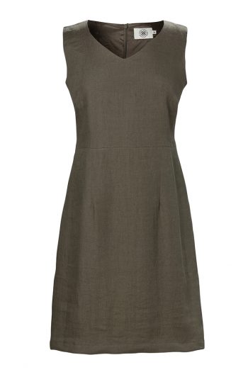 Alice klänning är tillverkad i 100% Italiensk lin och har en mycket vacker olivgrön färg. Modellen är en av våra absoluta favoriter.