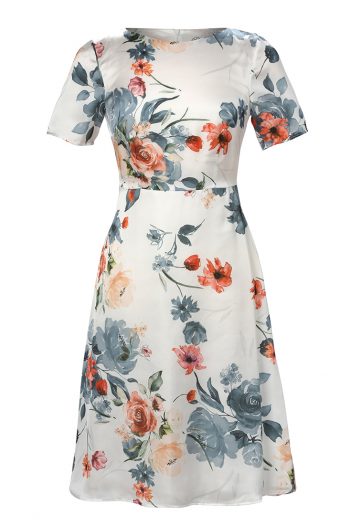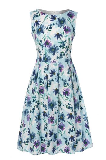 Isabel klänning är alldeles ljuvlig i sin blåblommiga bomullspoplin. Klänningen har en vackert rundad hals med en veckad kjol och är utan ärm.