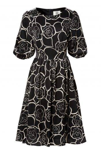 Salina klänning har en rundad hals, trekvarts ärm med ärmslut i resår vilket gör ärmen lite puffig. Midjan är rynkad och kjolen går strax under knät.