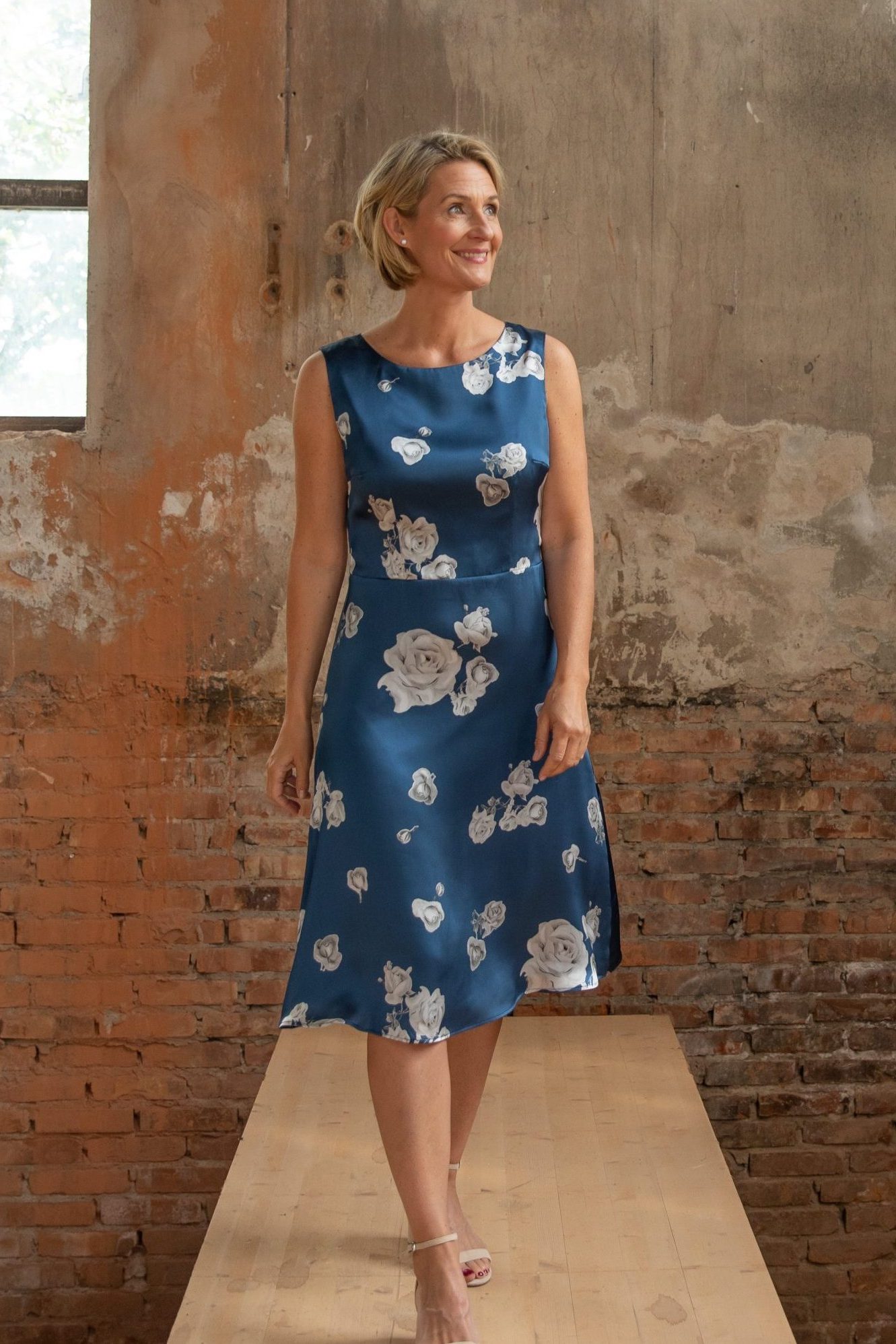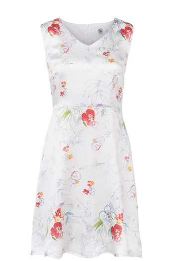 Somriga, vackra Lena klänning i 100% italiensk siden med vårt eget print av underbara vattenfärgsblommor på pärlemovit botten. Längd till knät med dold dragkedja i ryggen. Tillverkad i Sverige för en hållbar framtid!