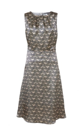 Linn klänning guld är tillverkad i finaste Italiensk siden med ett mjukt cupro foder. Tryckta mörkblå blommor på en guldskimrande botten och en dragkedja mitt bak.