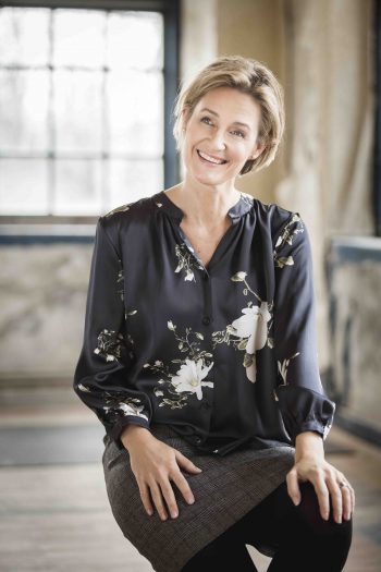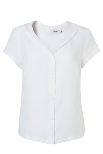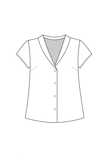 Underbara Mimmi blus har en fin v-ringning med sjalkrage och knäppning mitt fram. Blusen har en kort ärm och passar lika bra till byxa som kjol.
