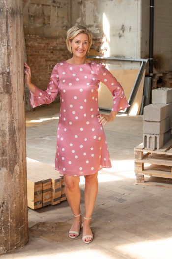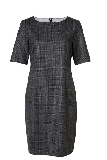 Karin klänning är en mycket omtyckt modell och favorit i Dughults sortiment. Klänningen har ett vackert skuret liv med ärm och en kjol som slutar nedanför knät.