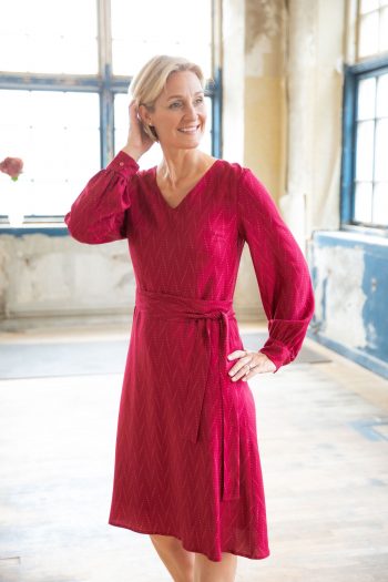 Ebba klänning är en av våra mest omtyckta modeller. Här i varma vinröda toner med ett tufft zig-zag mönster printat på en underbar viskos crepe