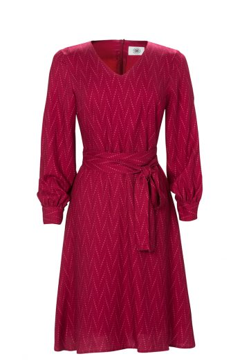 Madeleine klänning i varma vinröda toner har ett tufft zig-zag mönster printat på den underbar viskos crepe.