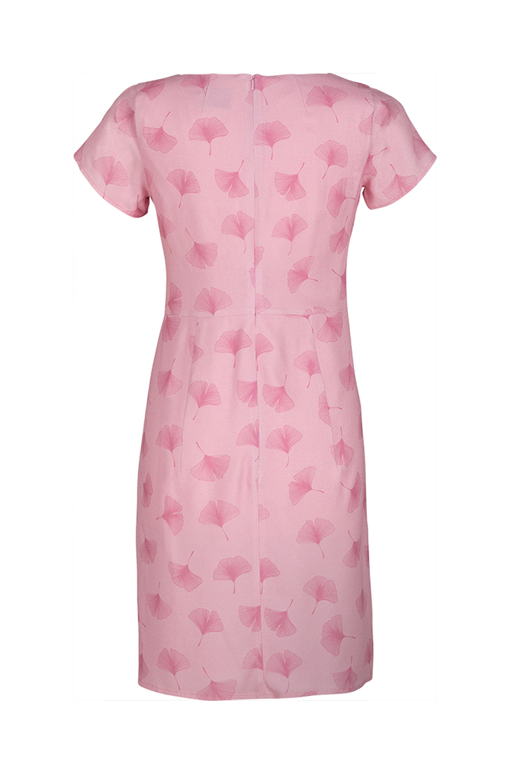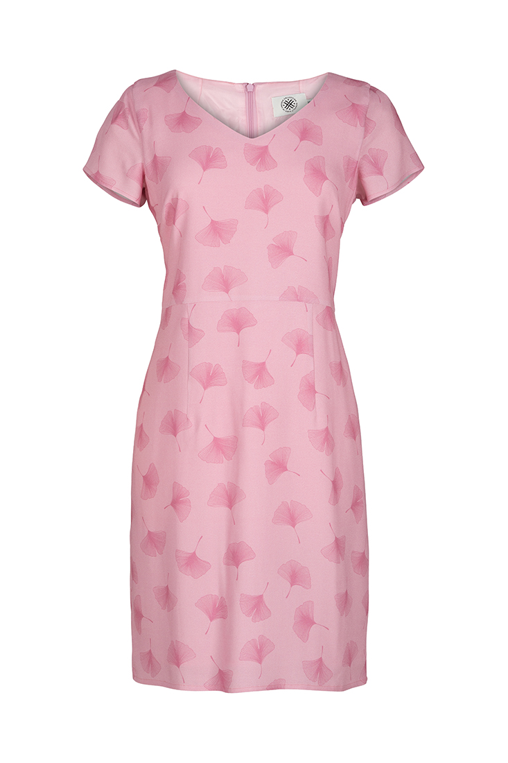 Alice ginko dress is a wonderful viscose dress with a nice lining in cupro. V-neck and short sleeves with zipper in the middle of the back. Now in our elegant pink tone in tone print. Made in Sweden for a sustainable future.