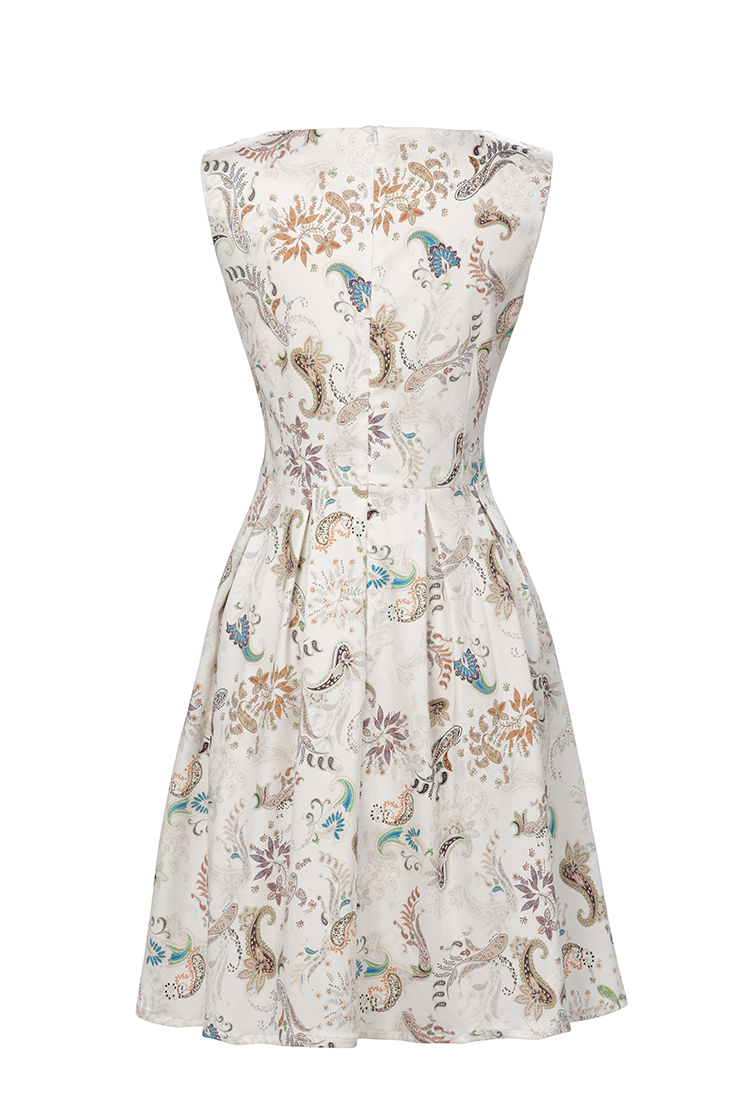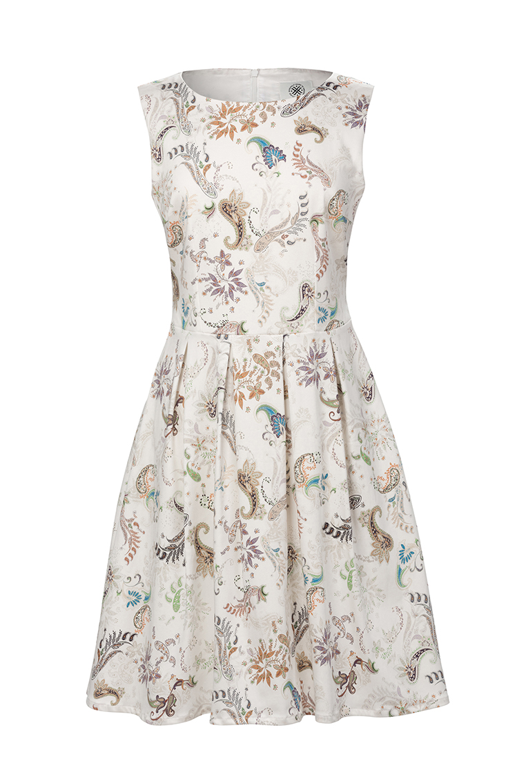 Aprilia klänning är en riktig klassiker. Här i en underbar bomullsstretch med cremefärgad botten och ett ljust paisleyprint. Klänningen är helfodrad i mjuk cupro och kjolen har vackra motveck runtom. Dragkedjan finner du i ryggen. En fantastisk klänning för dig som söker det där lilla extra. Tillverkad i Sverige för en hållbar framtid.