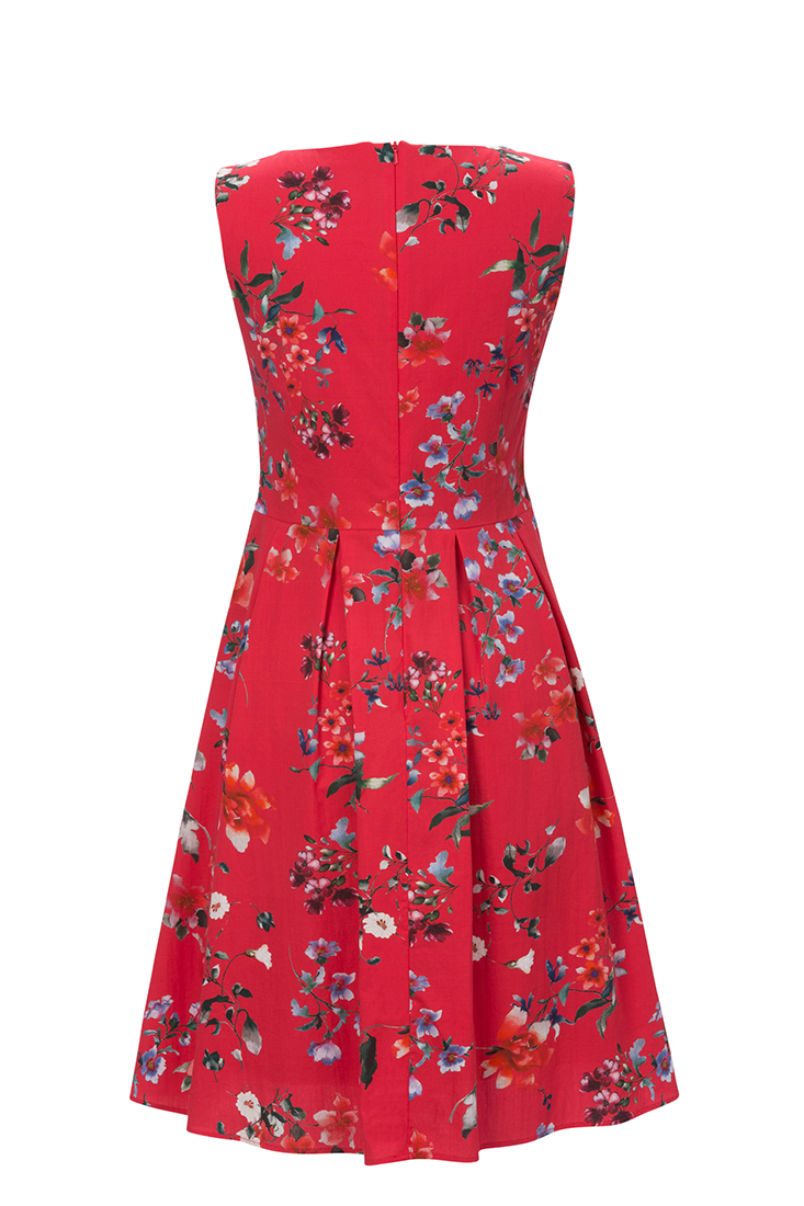 Aprilia klänning är en riktig favorit. Här i en vacker klarröd färg med blomrankor. Klänningen är gjord i bomullspoplin med med mjukt foder i cupro. Vid kjol med lagda veck som slutar vid på knät och dold dragkedja i ryggen. Tillverkad i Sverige för en hållbar framtid.