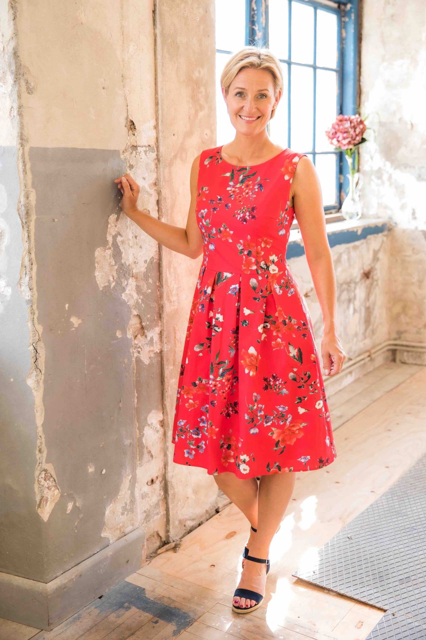 Aprilia klänning är en riktig favorit. Här i en vacker klarröd färg med blomrankor. Klänningen är gjord i bomullspoplin med med mjukt foder i cupro. Vid kjol med lagda veck som slutar vid på knät och dold dragkedja i ryggen. Tillverkad i Sverige för en hållbar framtid.