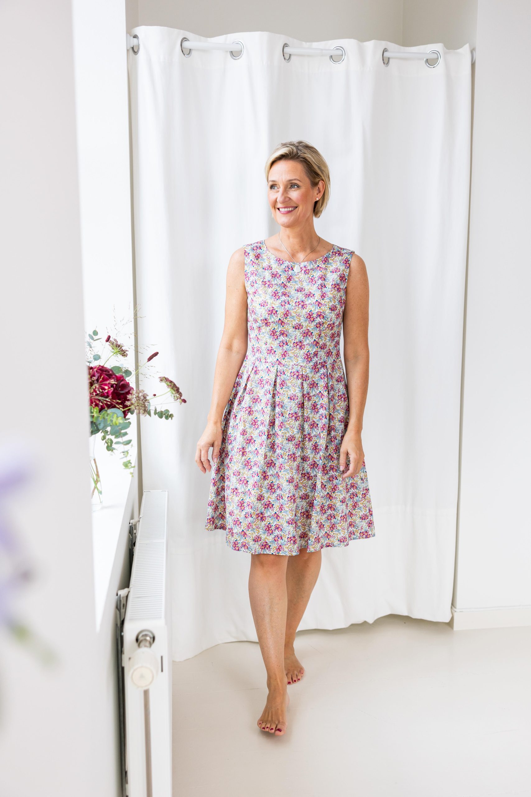 Aprilia klänning är en av Dughults mest klassiska klänningar. Här sydd i en vacker bomullspoplin från Liberty fabrics. Klänningen har en fin rundad hals med motveck i kjolen. Fodrad i en mjuk cupro med en dragkedja mitt bak i ryggen. En jättefin klänning som passar dig som tycker om småmönstrat. Tillverkad i Sverige för en hållbar framtid. Tyget är lite blekt på modellen men gör sig rättvisa på närbilden av tygprovet.