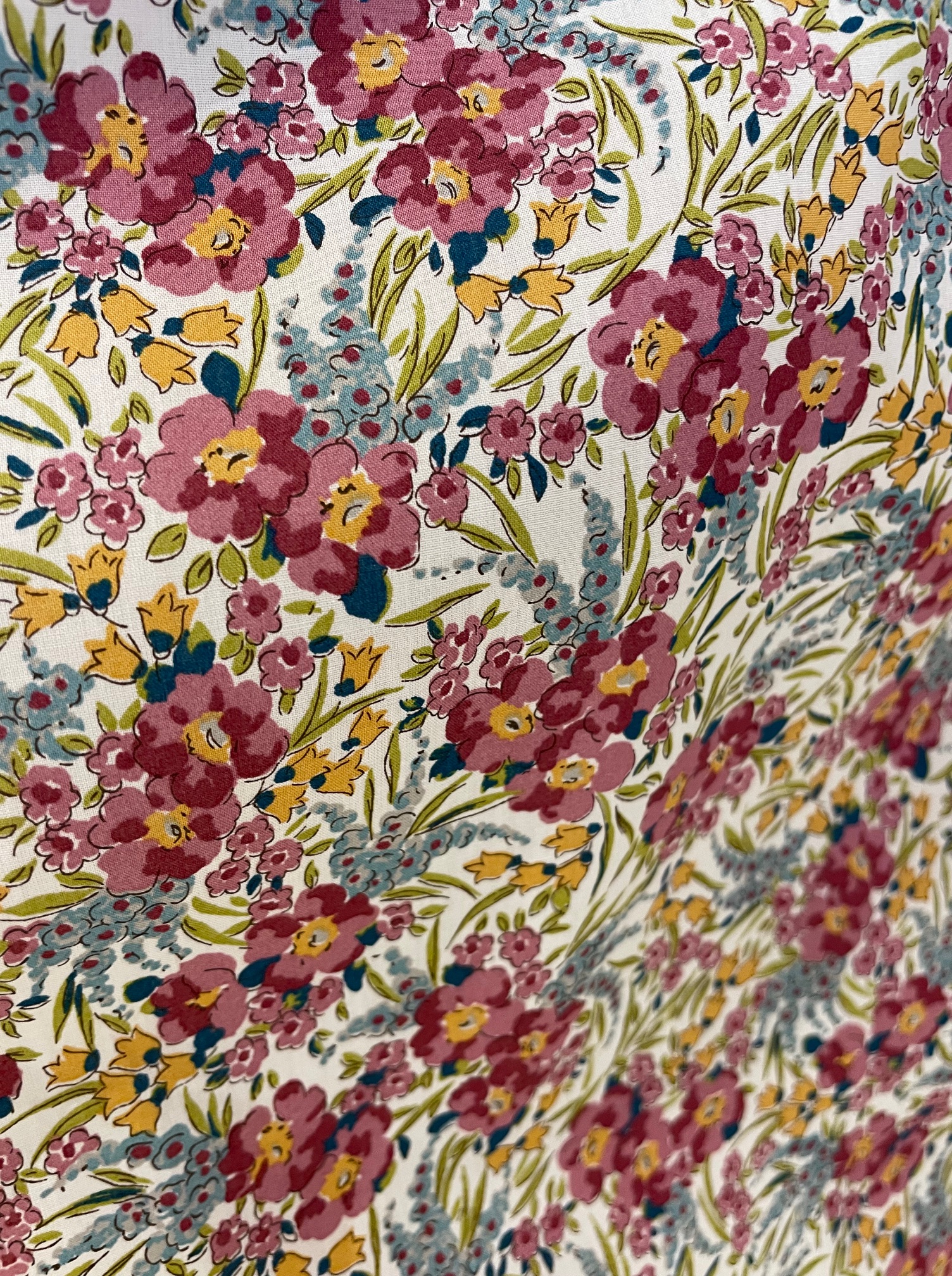 Ebba klänning är en riktigt favorit hos Dughult. Klänningen är skuren på längden med insnitt fram och bak vilket gör att den passar på många kvinnor. Här i en alldeles ljuvlig bomullsstretch på cremefärgad botten med rosa/orange blomster.