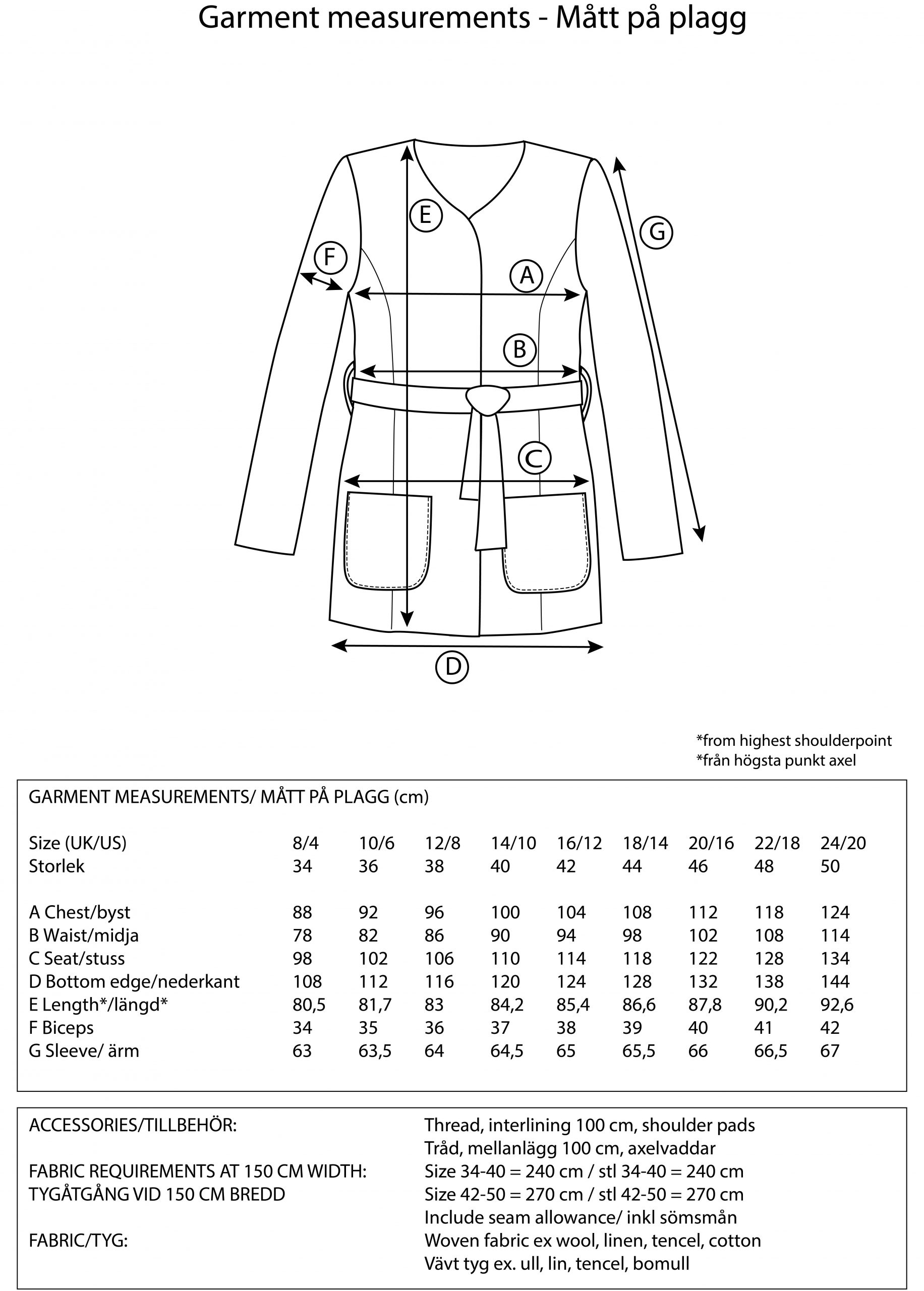 Mönstret finns i storlek 34-50 (storlek UK 8-24 & US 4-20). Mönstret är omsorgsfullt förpackat i ett kuvert och inkluderar samtliga storlekar. Svårighetsgrad lätt till medel. Sömsmån är inkluderat i mönstret som kommer med tydliga sömnadsinstruktioner där du kan följa steg för steg. Samtliga beskrivningar är både på engelska och svenska och finns som pappersmönster eller digital pdf för omgående leverans. Mönstret innefattar ytatyg med infodring, ej foder.