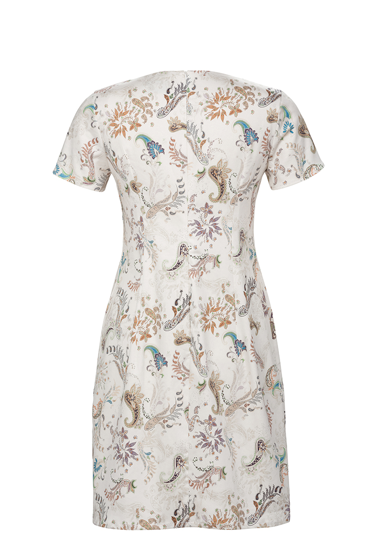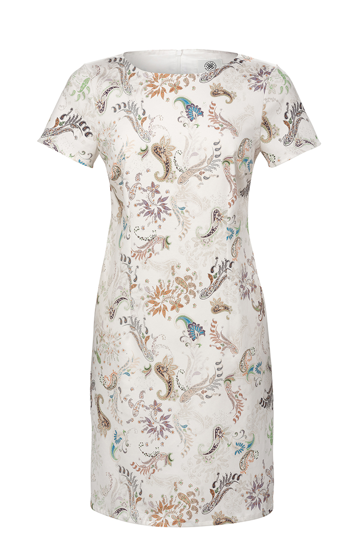 Ebba klänning är vackert helskuren med lodrät söm fram och bak för allra bästa passform. Klänningen har en vackert rundad hals och ärm med dragkedjan mitt bak. Här i en underbar bomullsstretch med cremebotten och ljust vackert paisleyprint. Klänningen är helfodrad i cupro och passar utmärkt både till vardag och fest. Tillverkad på vår fabrik i Sverige för en hållbar framtid! Titta i vår storleksguide för din rätta storlek.