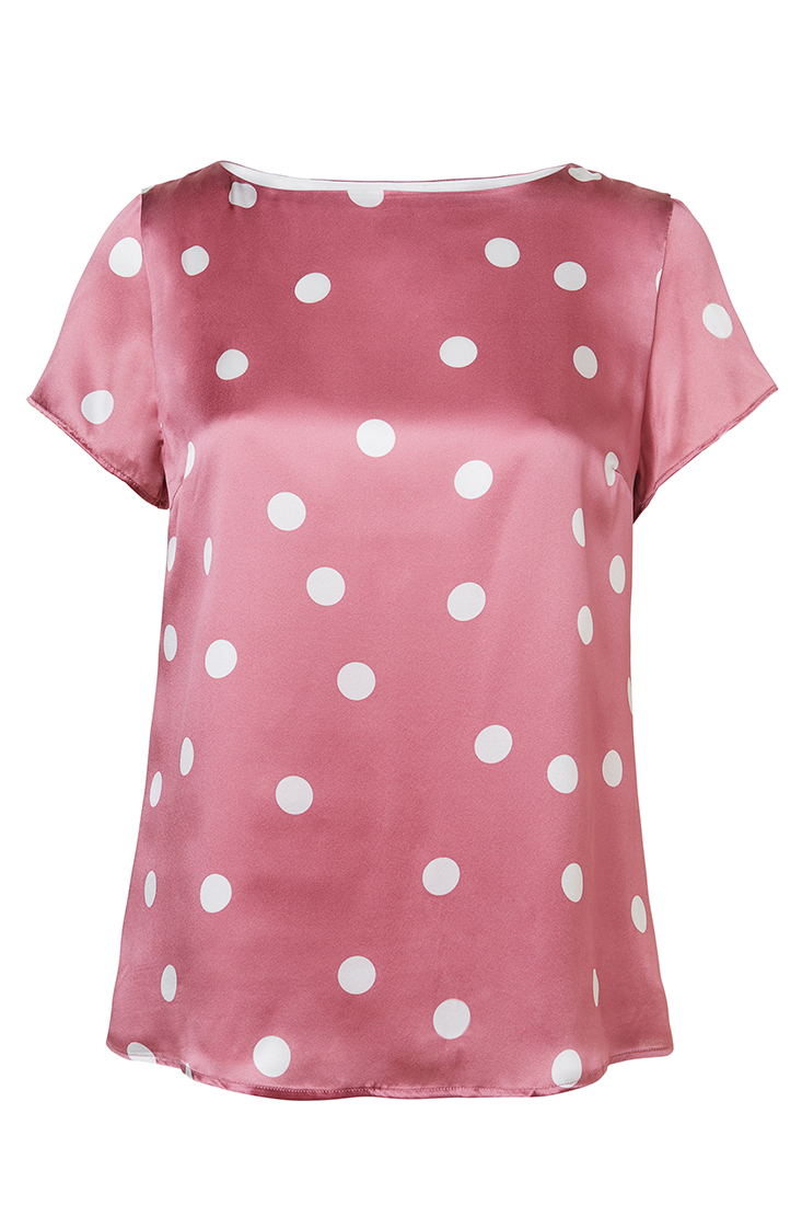 Our fine silk blouse every year passes boots neck and short sleeve. Sewn in 100% Italian silk with a comfortable fixed lining in cupro. Now presented in a pink bottom with a white dot. Goes well with both pant or skirt. Made in Sweden for a sustainable future!