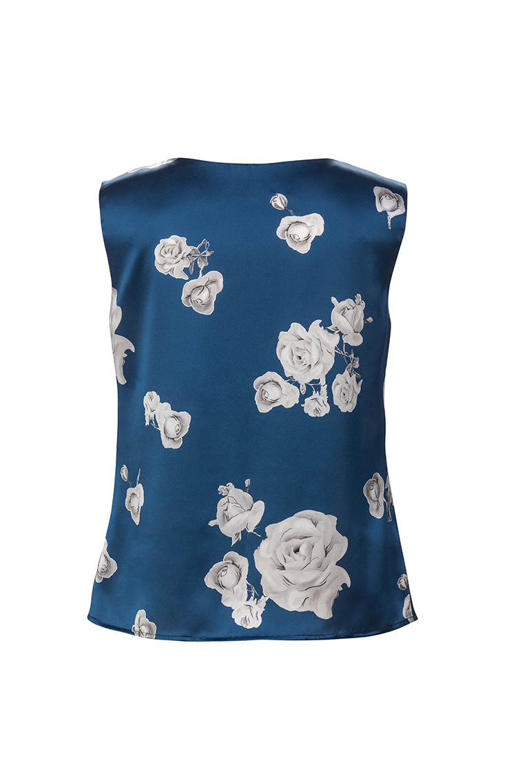Beautiful Jenny silk blouse with a small rounded collar, three-quarter sleeve and thin cuff. Sewn in 100% Italian silk with our own print, a magnificent wild rose on a blue shimmering bottom.