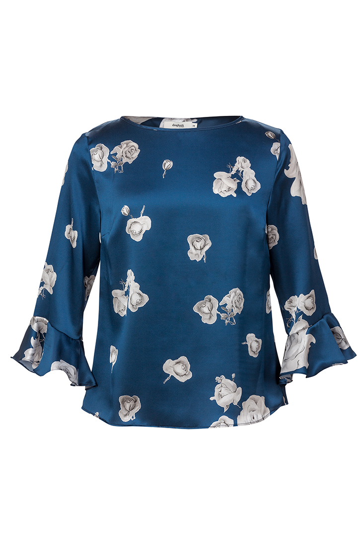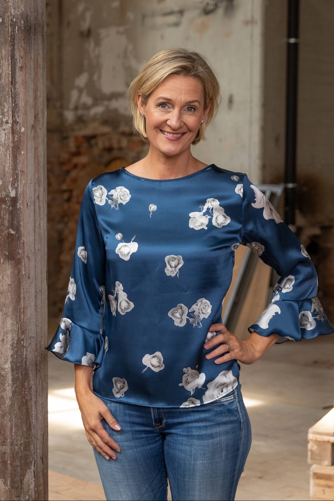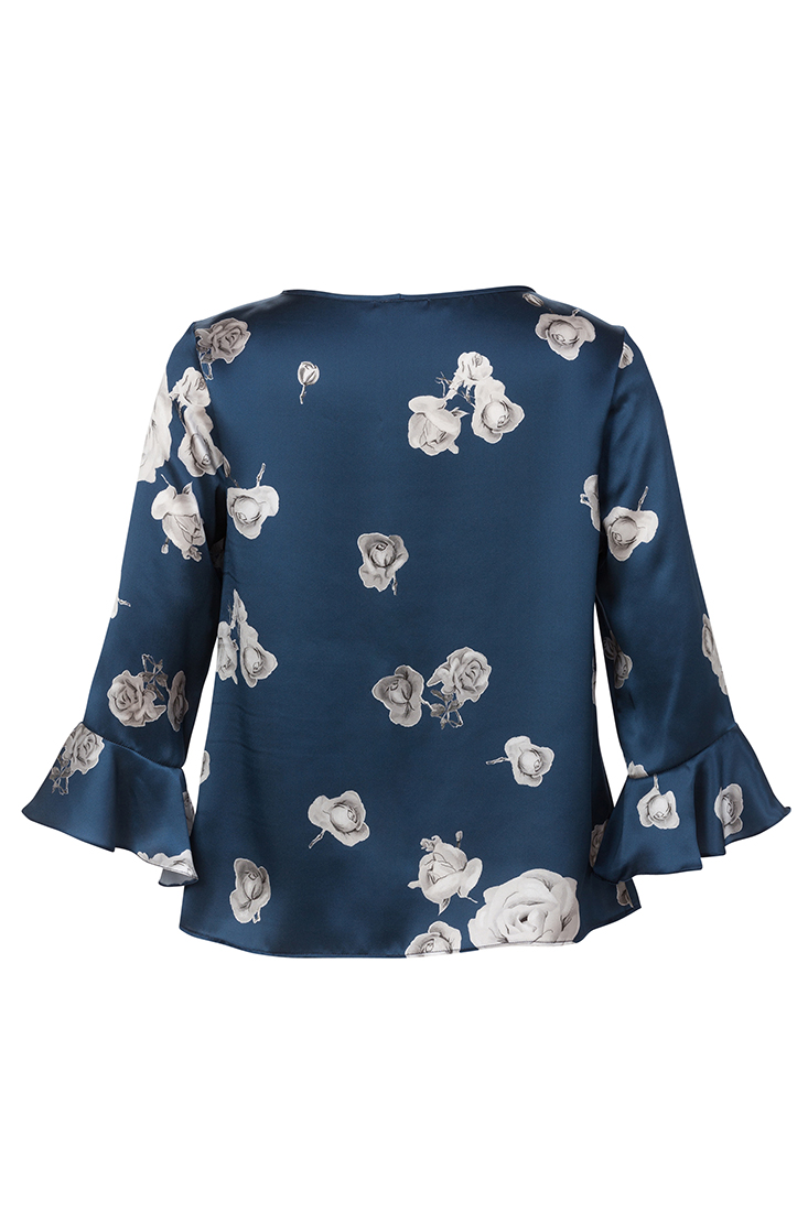 Vår vackra Gina blus är gjord i Italiensk siden med en vacker mörkblå botten och vitgrå rosor. Blusen har en rundad, väldigt behaglig hals med trekvart ärm som slutar med en volang. Blusen är perfekt att matcha till både jeans och våra egna kjolar i mörkblått. Vacker som den är eller tillsammans med ett pärlhalsband. Tillverkad på fabrik i Sverige för en hållbar framtid! Titta i vår storleksguide för att hitta din rätta storlek.