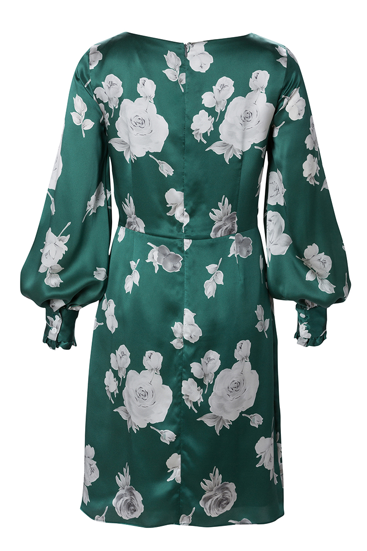 Gina dress is truly an eyecatcher. Here in a dark green shimmering silk with white-gray roses. With its generous sleeves and cuffs, it is something really special. The dress is made of Italian silk, fully lined with a zipper in the middle of the back. The sleeve cuffs have mother-of-pearl buttons and end in a frill. The skirt goes just below the knee. Made in our factory in Sweden for a sustainable future! Look in our size guide for your right size.