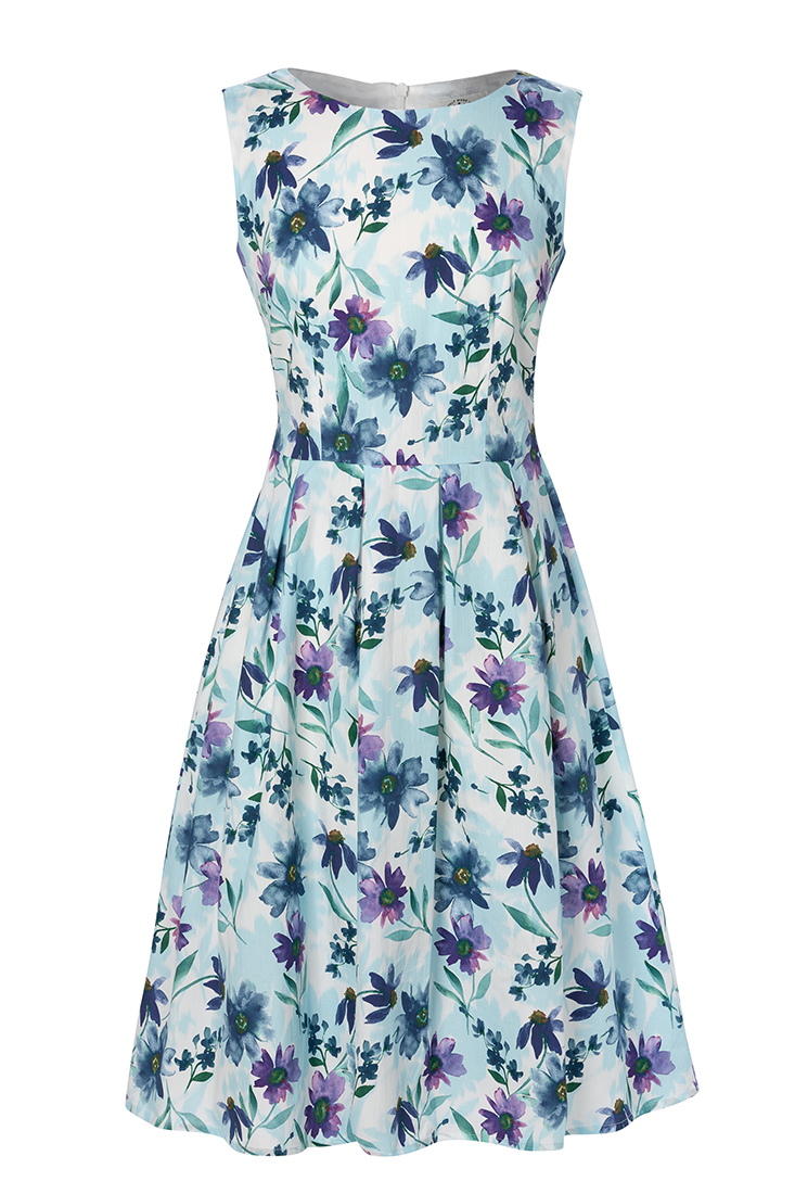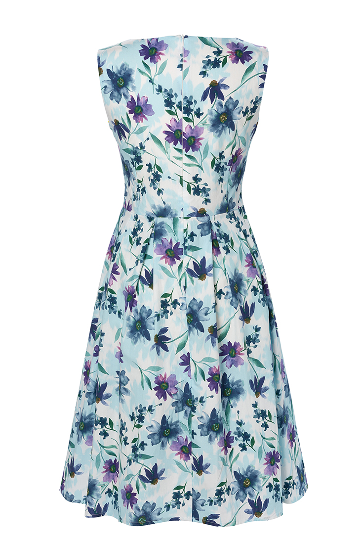 Isabelle klänning är alldeles ljuvlig i sin blåblommiga bomullspoplin. Klänningen har en vackert rundad hals med en veckad kjol och är utan ärm. Modellen är helfodrad i mjuk cupro och har en dragkedja mitt bak. Passar perfekt till festen men även med ett par sneakers för en ledigare stil. Tillverkad på fabrik i Sverige för en hållbar framtid.
