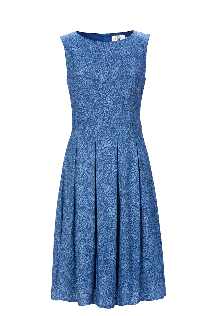 Aprilia klänning är en klassisk modell och favorit i Dughults sortiment. Klänningen har ett vackert skuret liv med vid kjol och motveck i kjolen.