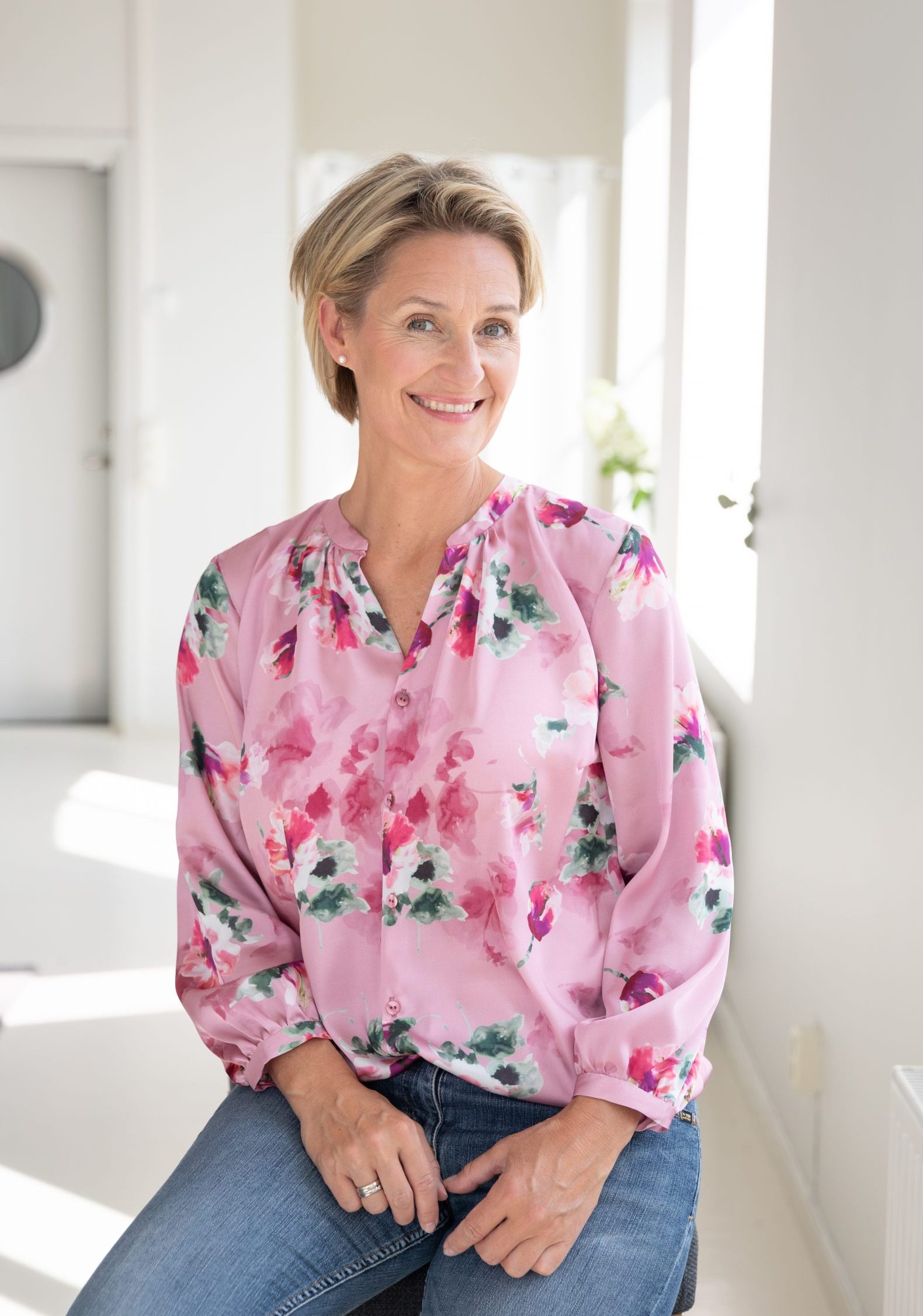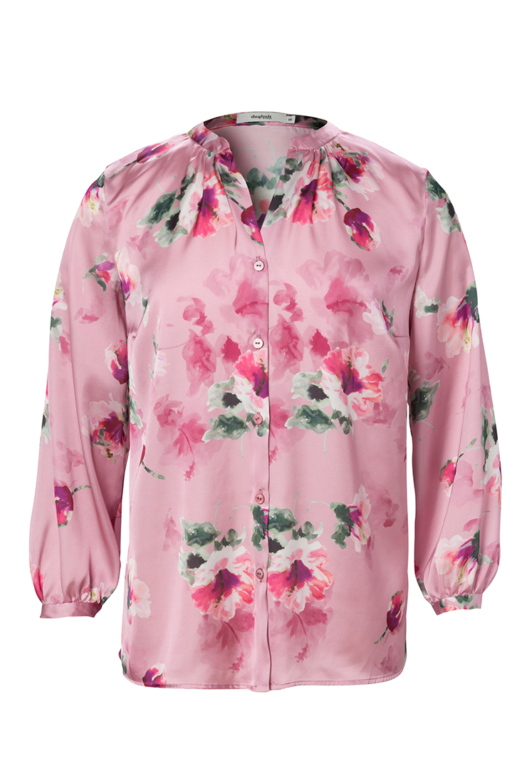 Dughults vackra sidenblus Jenny har en rund och lite nättare krage med en trekvarts ärm som avslutas med en smal manschett. Printet hibiskus är Dughults egna. Blommorna ser målade ut och ligger på en skimrande rosa botten. Blusen är riktigt magisk och passar lika fint till kostymbyxor som till ett par jeans. Tillverkad på fabrik i Sverige för en hållbar framtid!