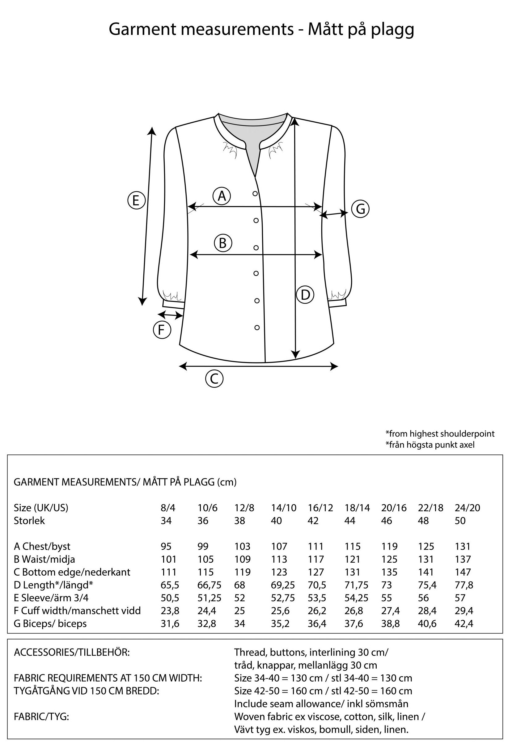 Mönstret finns i storlek 34-50 (storlek UK 8-24 & US 4-20). Paketet inkluderar samtliga storlekar och kommer förpackat i ett kuvert. Svårighetsgrad medel. Sömsmån är inkluderat i mönstret som kommer med tydliga sömnadsinstruktioner där du kan följa steg för steg. Samtliga beskrivningar är både på engelska och svenska och finns som pappersmönster eller digital pdf för omgående leverans.