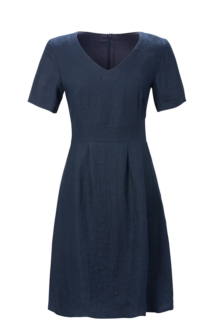 Aprilia klänning är en klassisk modell och favorit i Dughults sortiment. Klänningen har ett vackert skuret liv med vid kjol och motveck i kjolen.