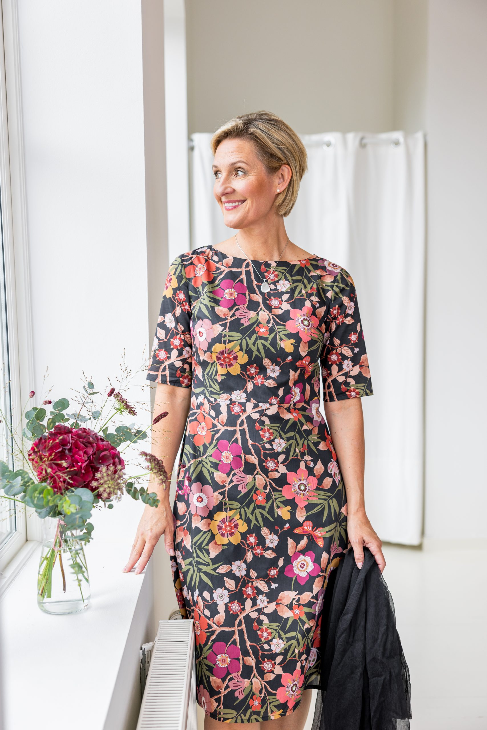 Karin klänning grönska med halvlång ärm är en riktig pärla. Klänningen är tillverkad i en tunn och vacker bomullspoplin från Liberty fabrics och har ett foder i mjuk cupro. Den är flygande lätt att ha på kroppen. Karin har ett avskuret liv och en vackert rundad hals. Klänningen har en dragkedja mitt bak och ärmen mäter cirka 30 cm i stl 38. Tillverkad på fabrik i Sverige för en hållbar framtid! Titta i vår storleksguide för din rätta storlek.