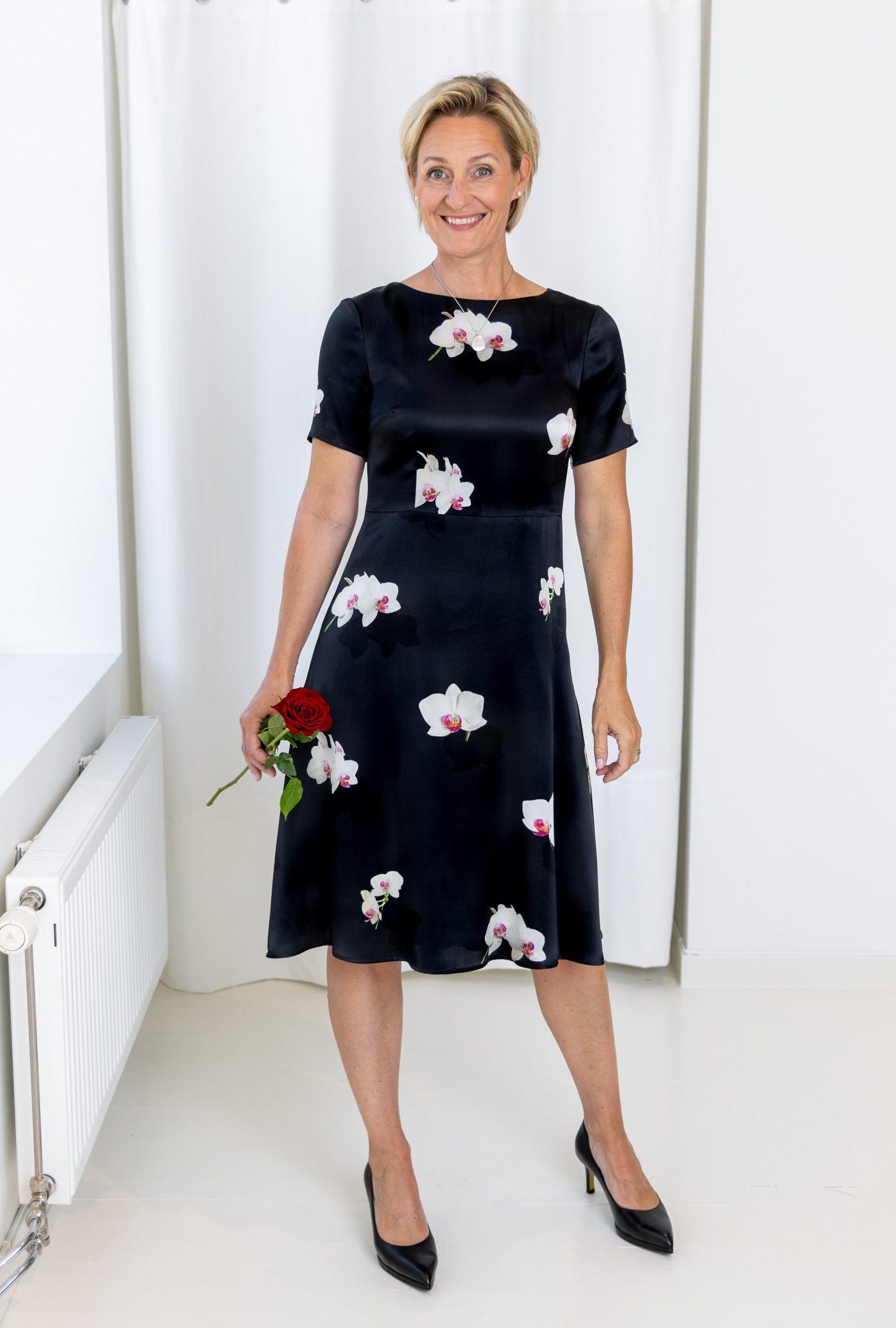 En riktigt favorit är Dughults Karin klänning orkidé. Tillverkad i de vackraste av sidentyger på en mörk skimrande botten med vita orkidéer. Klänningen är en repris från 2017 och vi säljer den så länge vi har tyg kvar. Karin har ett skuret liv och en vackert rundad hals. En kort ärm och dragkedja mitt bak. Helfodrad med mjuk cupro blir den ett smycke på vilken fest som helst. Tillverkad i vår fabrik i Sverige för en hållbar framtid! Titta i vår storleksguide för din rätta storlek.