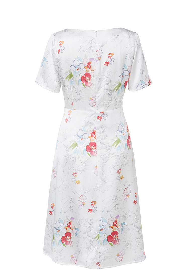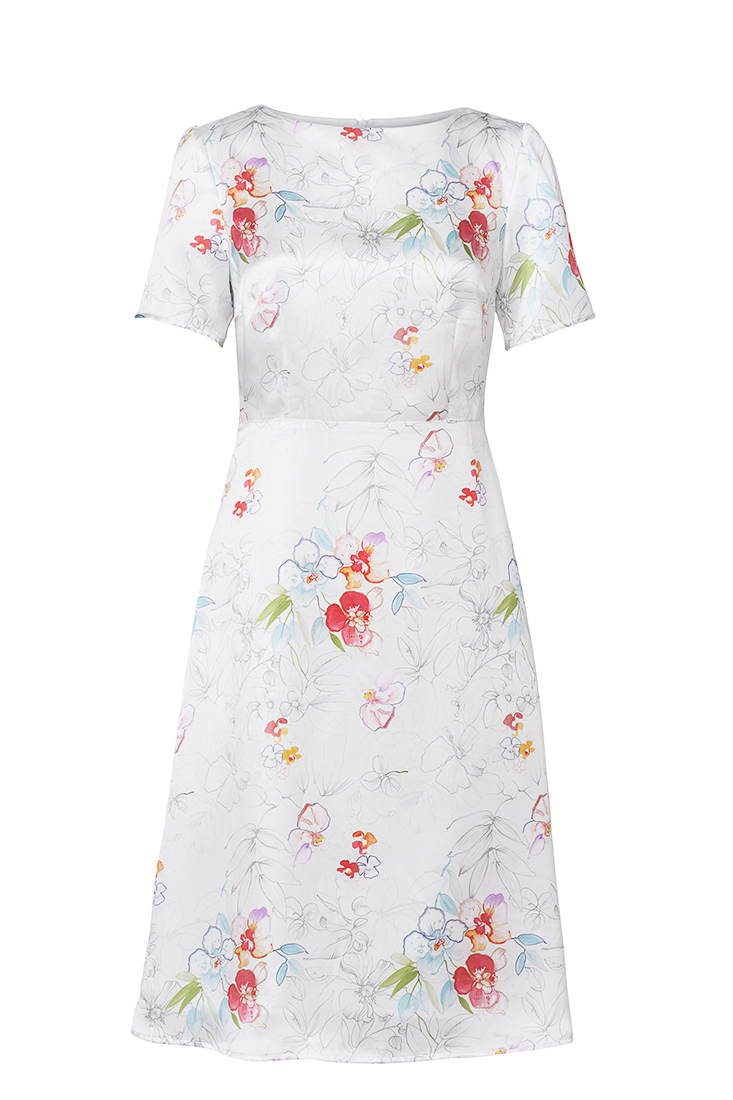 Vår kronjuvel, Karin sidenklänning är något alldeles extra. Här i vårt eget underbara print av vackra vattenfärgsblommor på pärlemorvit botten, tryckta på finaste italienskt siden. Klädsam rundad halsringning, helfodrad med kort ärm, dold dragkedja i ryggen och en böljande kjol som slutar en bit nedan knät. En riktig midsommardröm. Tillverka i Sverige för en hållbar framtid.