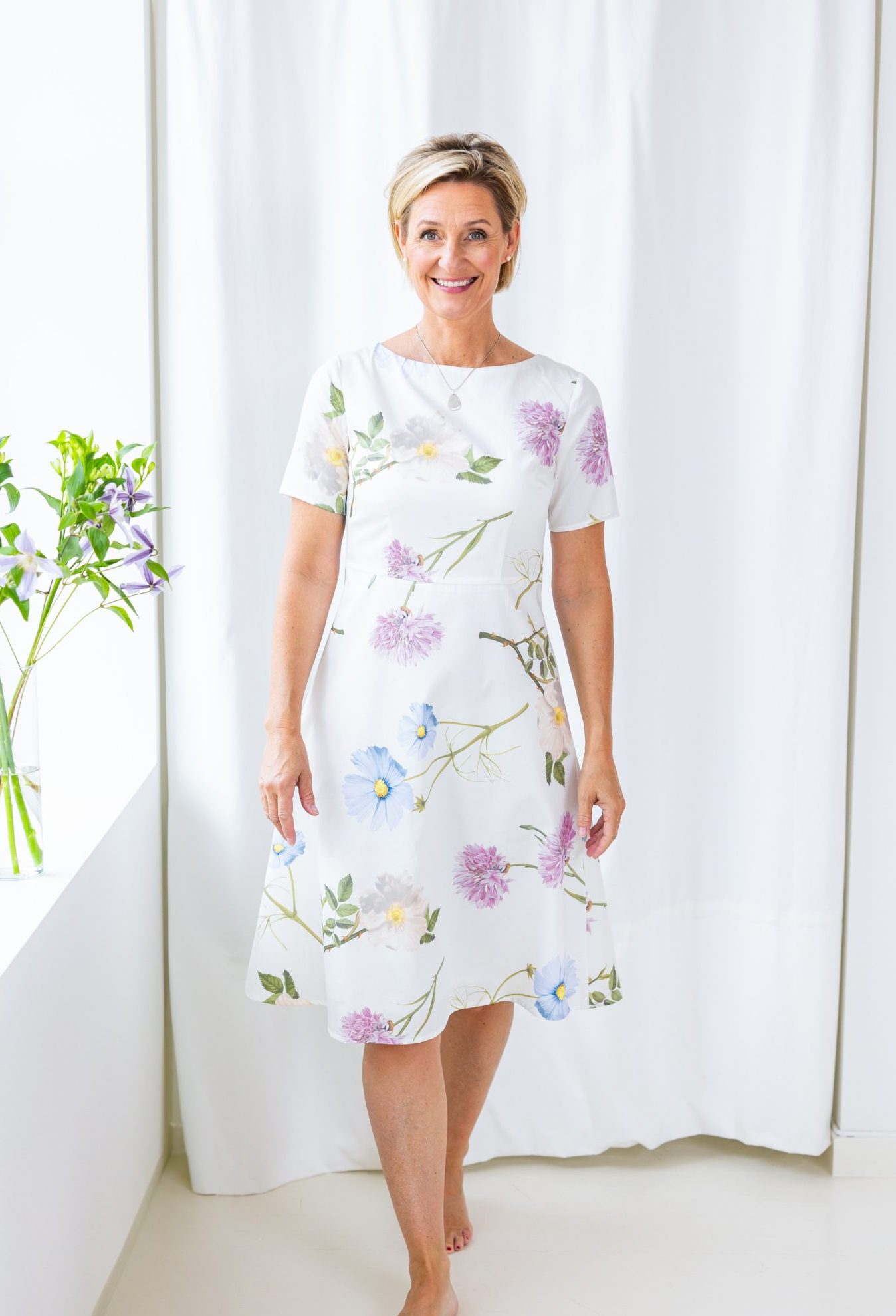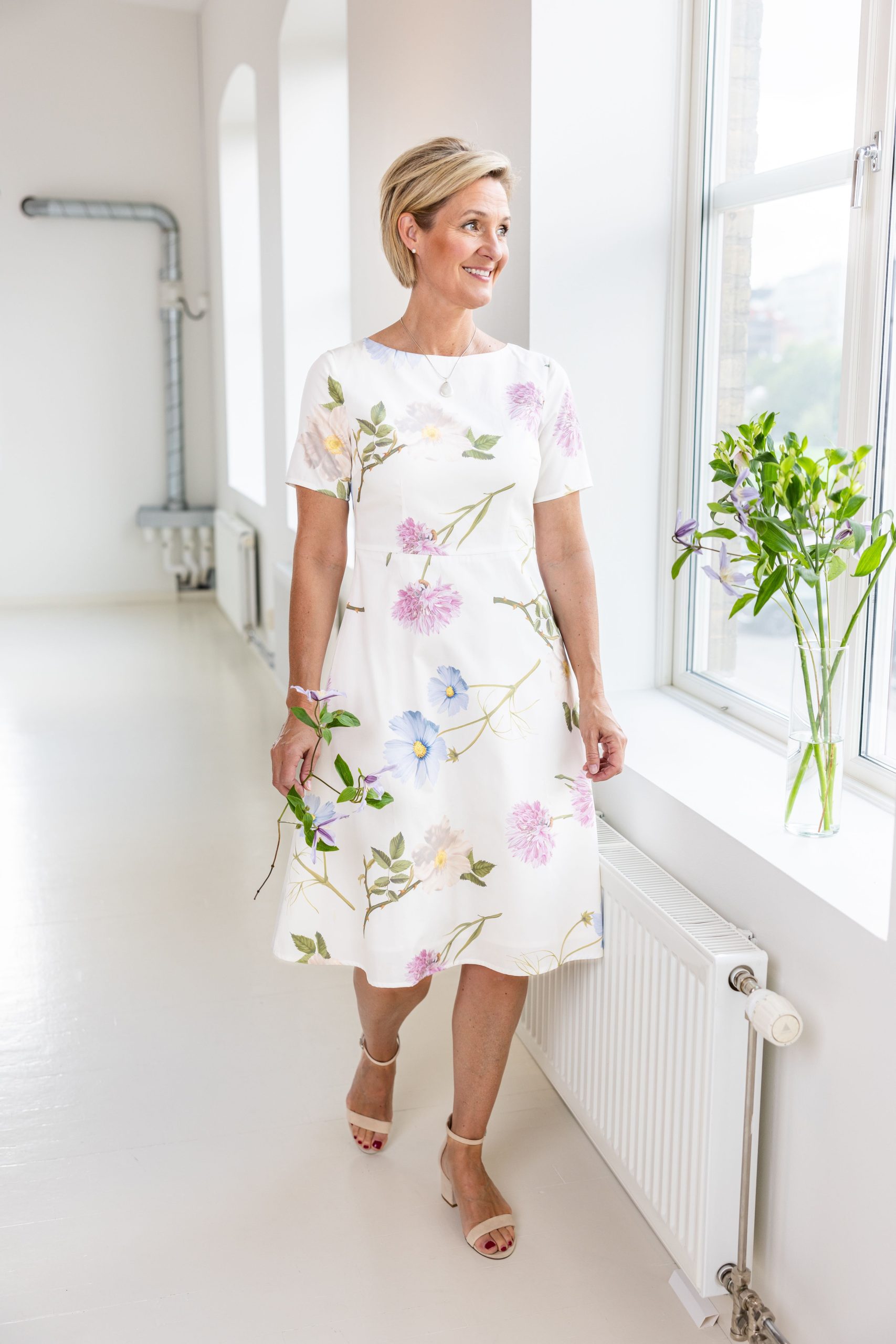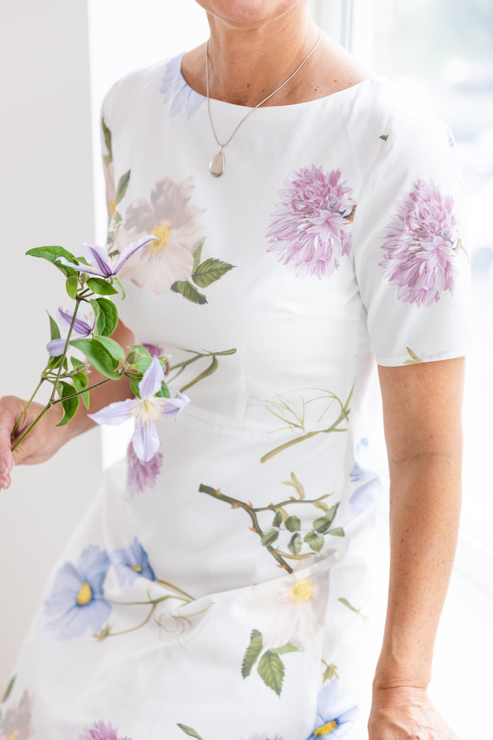 Vår vackra Karin klänning är en riktig klassiker. Namngiven efter min mormor och sydd i en magisk bomullspoplin från Liberty fabrics. Fodrad i mjuk cupro och med dragkedja mitt bak. Karin klänning har ett skuret liv med en vackert rundad båthals och kort ärm. Tillverkad på fabrik i Sverige för en hållbar framtid! Titta i vår storleksguide för din rätta storlek.
