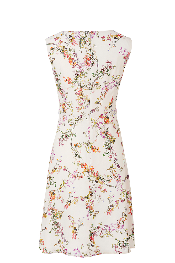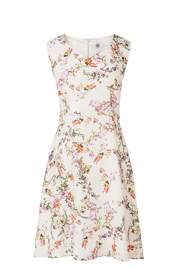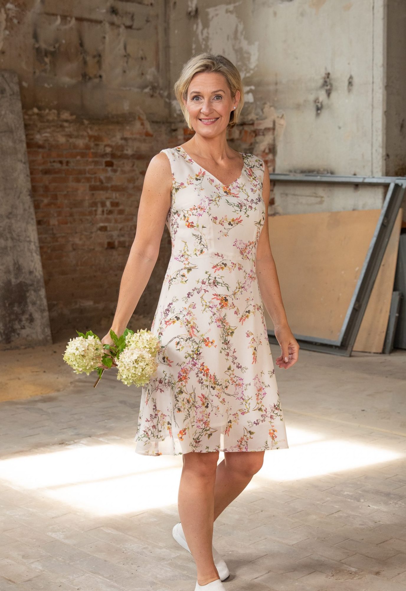 Somriga, vackra Lena klänning i 100% italiensk siden med vårt eget print av underbara vattenfärgsblommor på pärlemovit botten. Längd till knät med dold dragkedja i ryggen. Tillverkad i Sverige för en hållbar framtid!