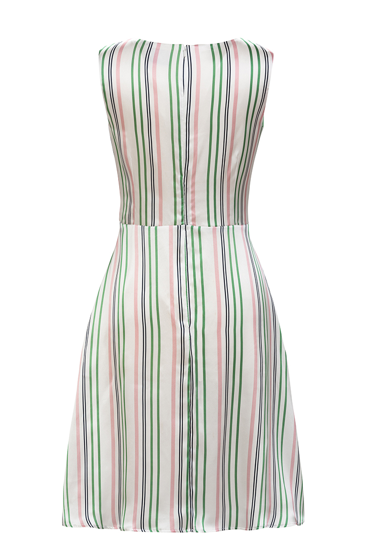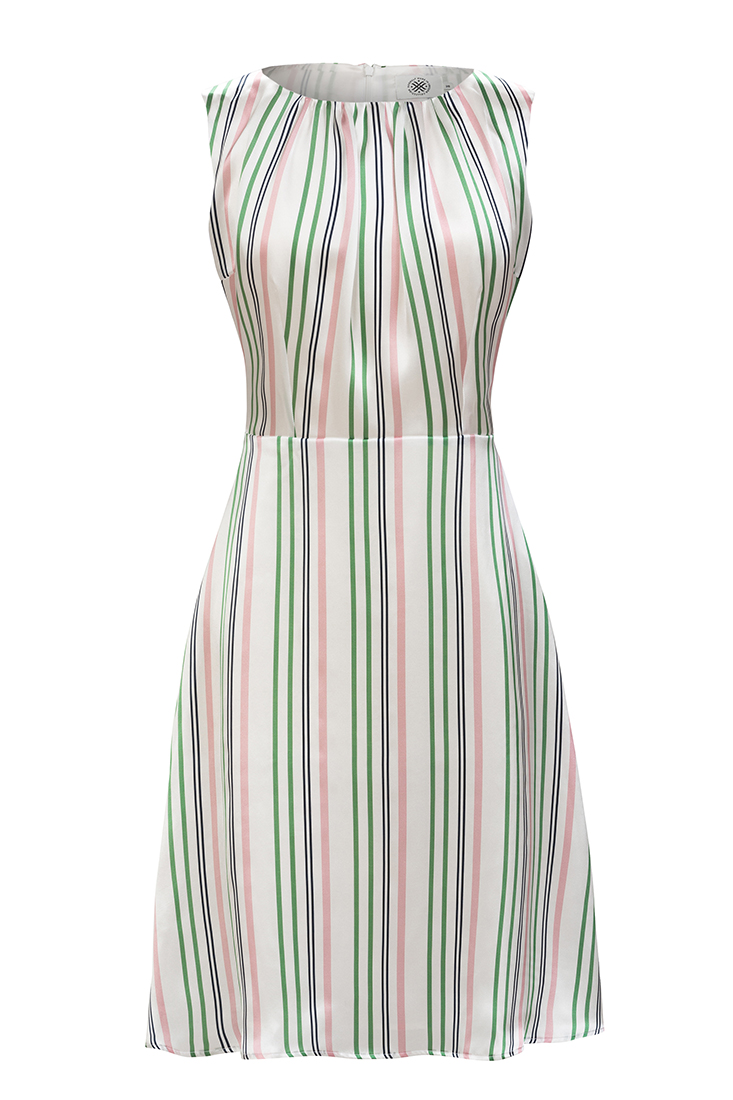 Linn klänning har en snygg draperad halsringning och är utan ärm. Klänningen är helfodrad i mjuk cupro och har en dragkedja mitt bak. Här i Dughults eget print i en pastellfärgad rand. Tillverkad på vår fabrik i Sverige för en hållbar framtid! Titta i vår storleksguide för din rätta storlek.