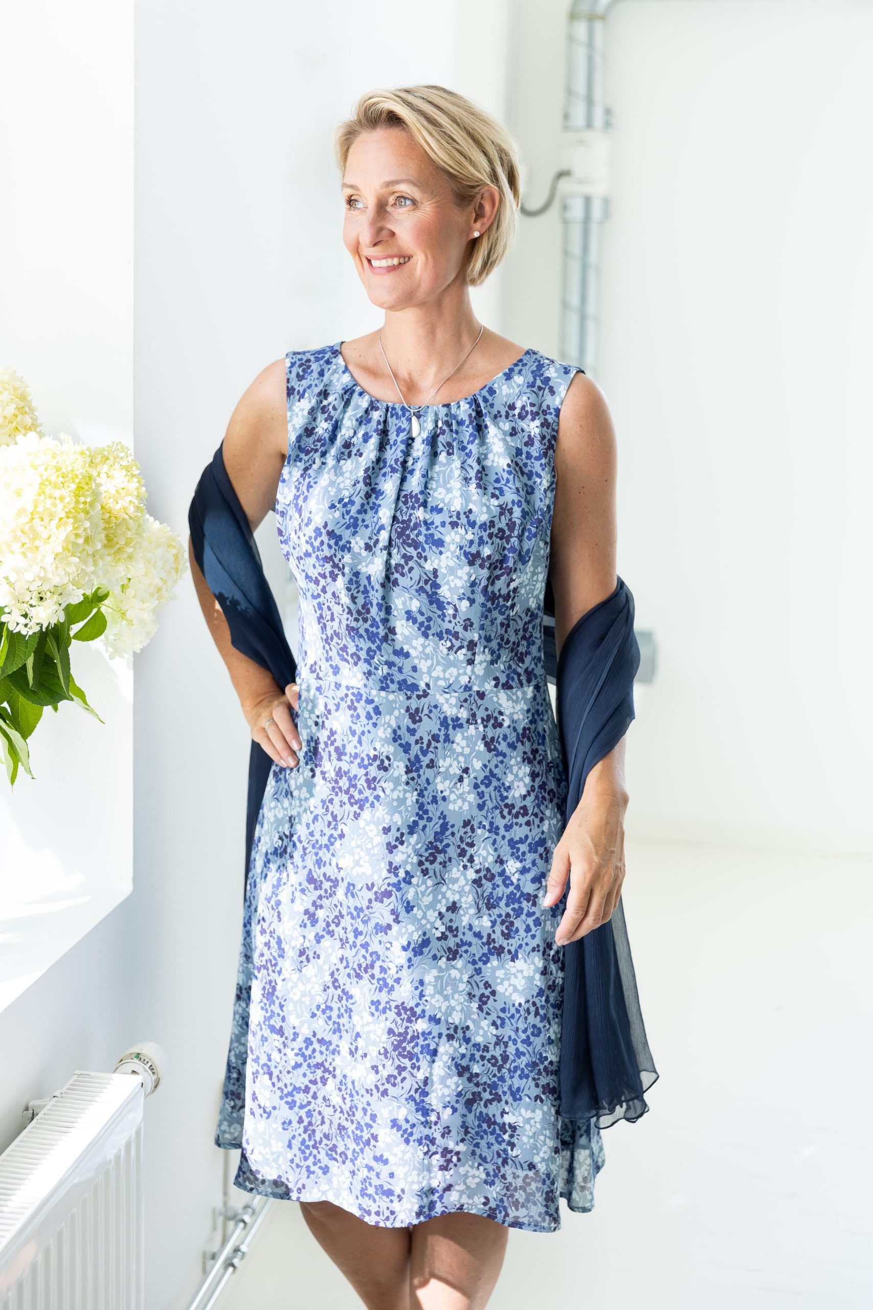 Visst är den vacker? Vår ljuvliga, underbara Linn klänning blå äng. Klänningen har en rund rynkad hals och avskuret liv och vackert utställd kjol. Precis som alla våra klänningar är även Linn blå äng helfodrad i mjuk cupro och har dragkedja mitt bak. Kjolen slutar strax nedanför knä. En klänning som passar alla tillställningar. Vacker också tillsammans med en av våra sjalar i sidenchiffong. Den virar du snabbt runt dina axlar om det är kyligt. Sydd på fabrik här i Sverige för en hållbar framtid.