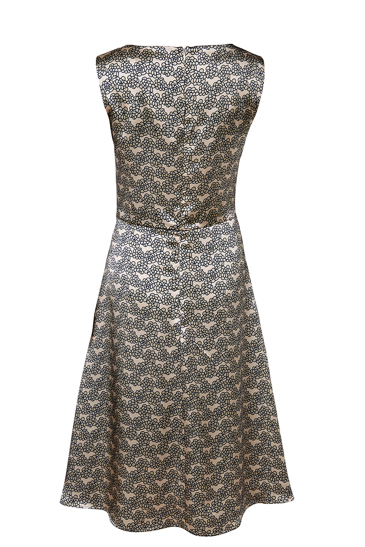 Linn klänning guld är tillverkad i finaste Italiensk siden med ett mjukt cupro foder. Tryckta mörkblå blommor på en guldskimrande botten och en dragkedja mitt bak. Klänningen är ärmlös och har en lätt rundad hals med drapering fram. Kjolen slutar nedanför knät. En klänning som passar till alla festligheter. Tillverkad i Sverige, för en hållbar framtid.