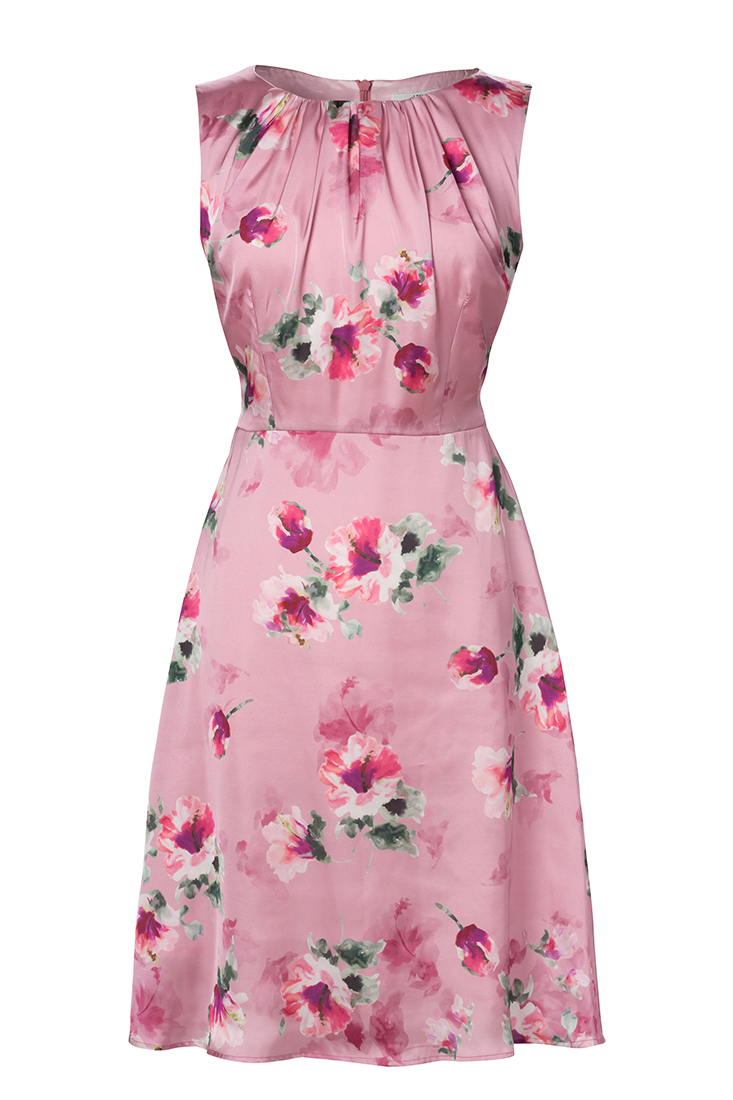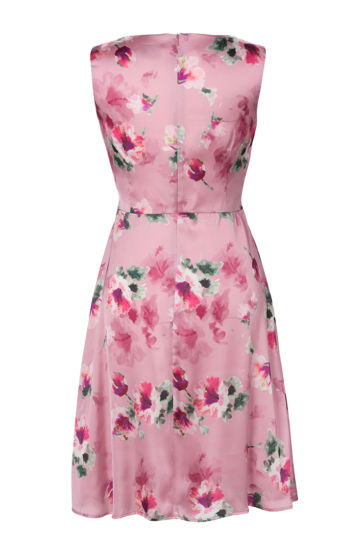 Maja sidenklänning är tillverkad i finaste Italiensk siden och tryckt i trendig vit prick på bottenfärg gammalrosa. Lättburen för alla tillfällen.