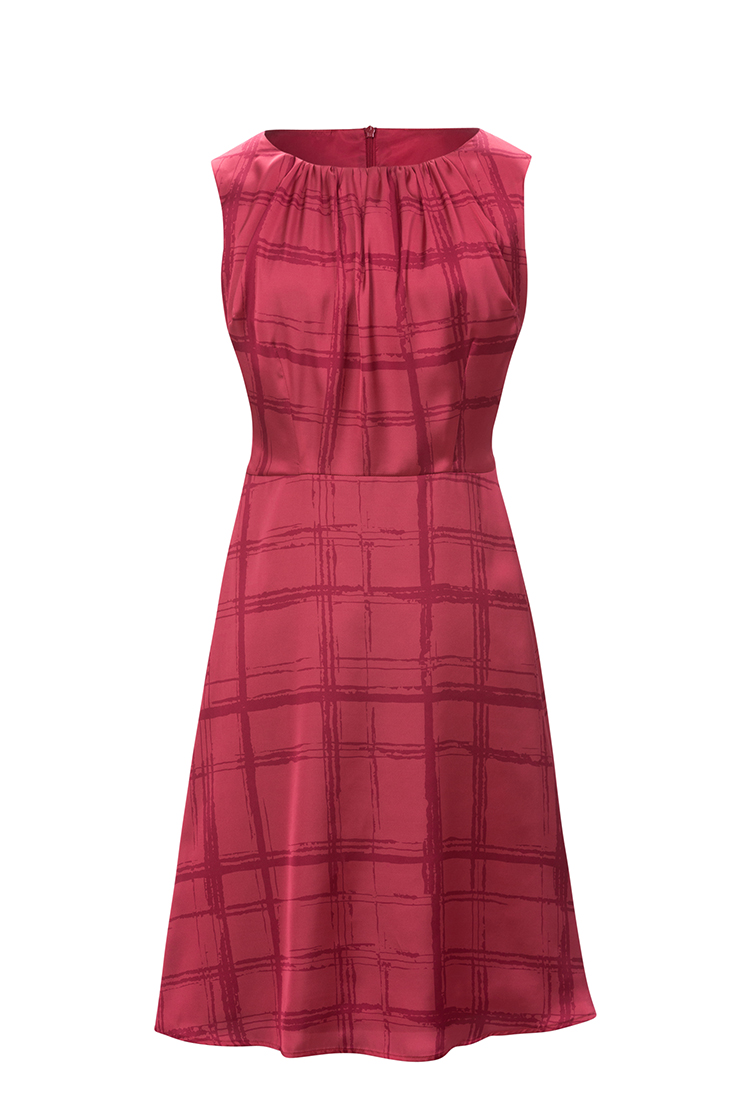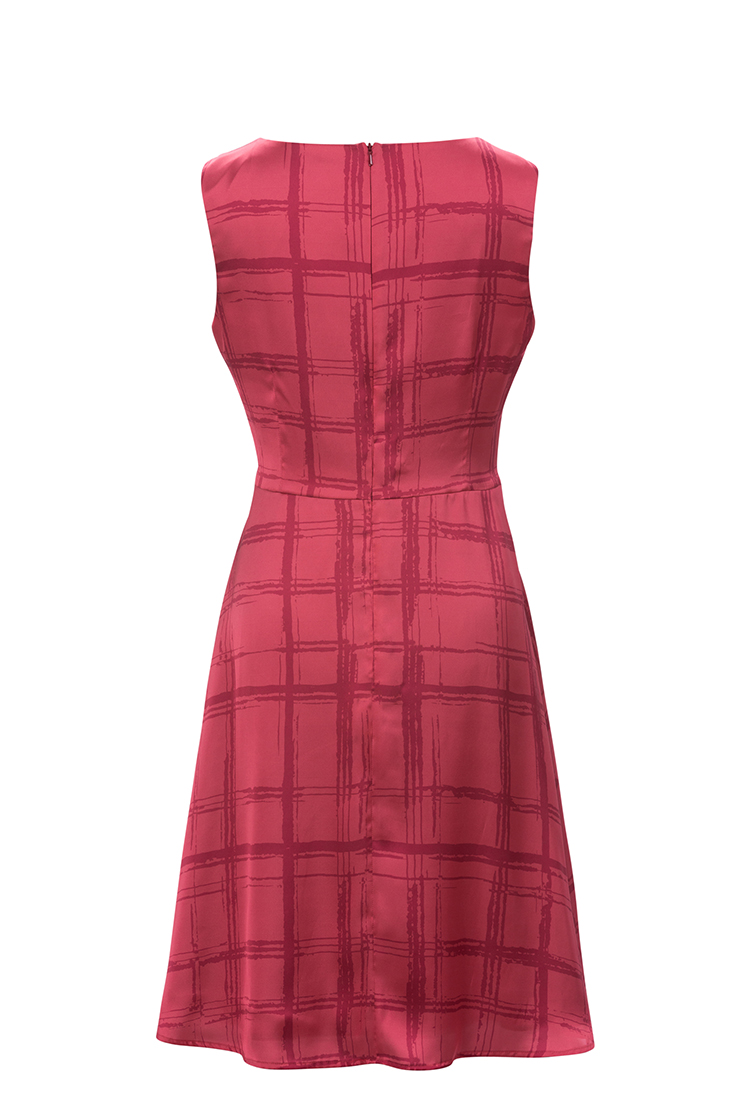 Linn klänning ruta är tillverkad i finaste Italiensk siden med ett mjukt foder i cupro. En vacker ruta i Dughults egen design på en skimrande korallröd botten och en dragkedja mitt bak. Klänningen är ärmlös och har en lätt rundad hals med drapering fram. Kjolen slutar nedanför knät. En klänning som passar till alla festligheter. Tillverkad i Sverige, för en hållbar framtid!