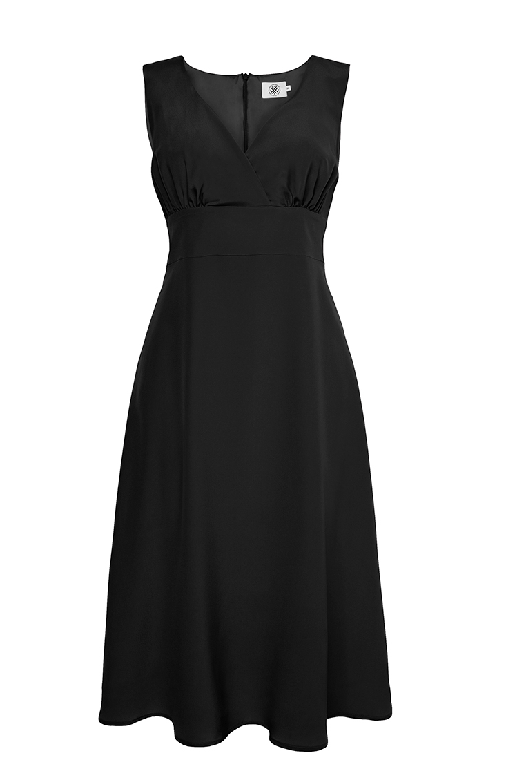 Alice klänning är en klassisk favorit med avskuret liv i midjan och dragkedja mitt bak. Klänningen är v-ringad och utan ärm. Lika fin i tunnare siden som ett kraftigare ulltyg.