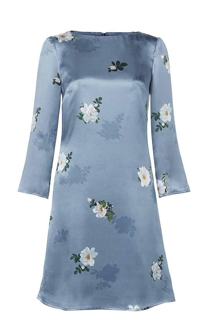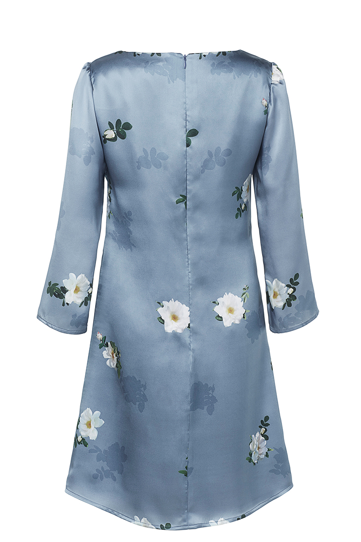 Maja dress is sewn in the finest Italian silk, printed with our own print of wild honey roses on a shimmering blue background. The dress has boatneck three-quarter sleeves. Maja dress is fully lined and ends at the knee. Hidden zipper in the middle of the back. Made in Sweden for a sustainable future.