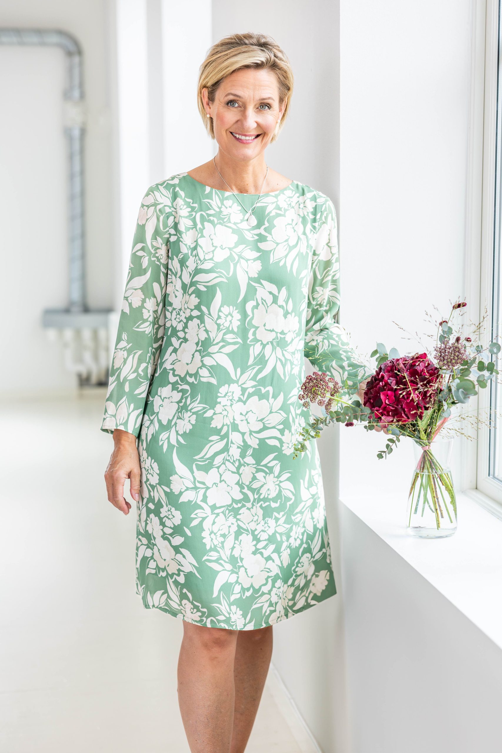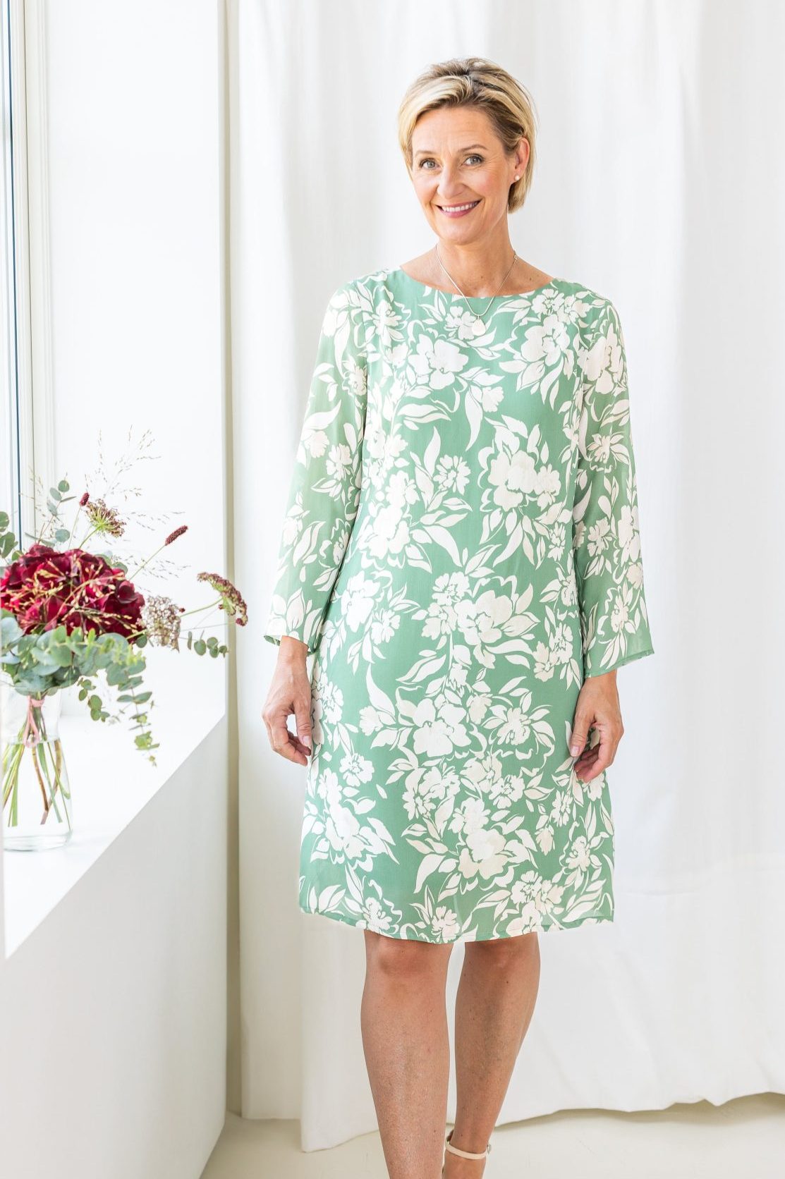Somriga, vackra Lena klänning i 100% italiensk siden med vårt eget print av underbara vattenfärgsblommor på pärlemovit botten. Längd till knät med dold dragkedja i ryggen. Tillverkad i Sverige för en hållbar framtid!