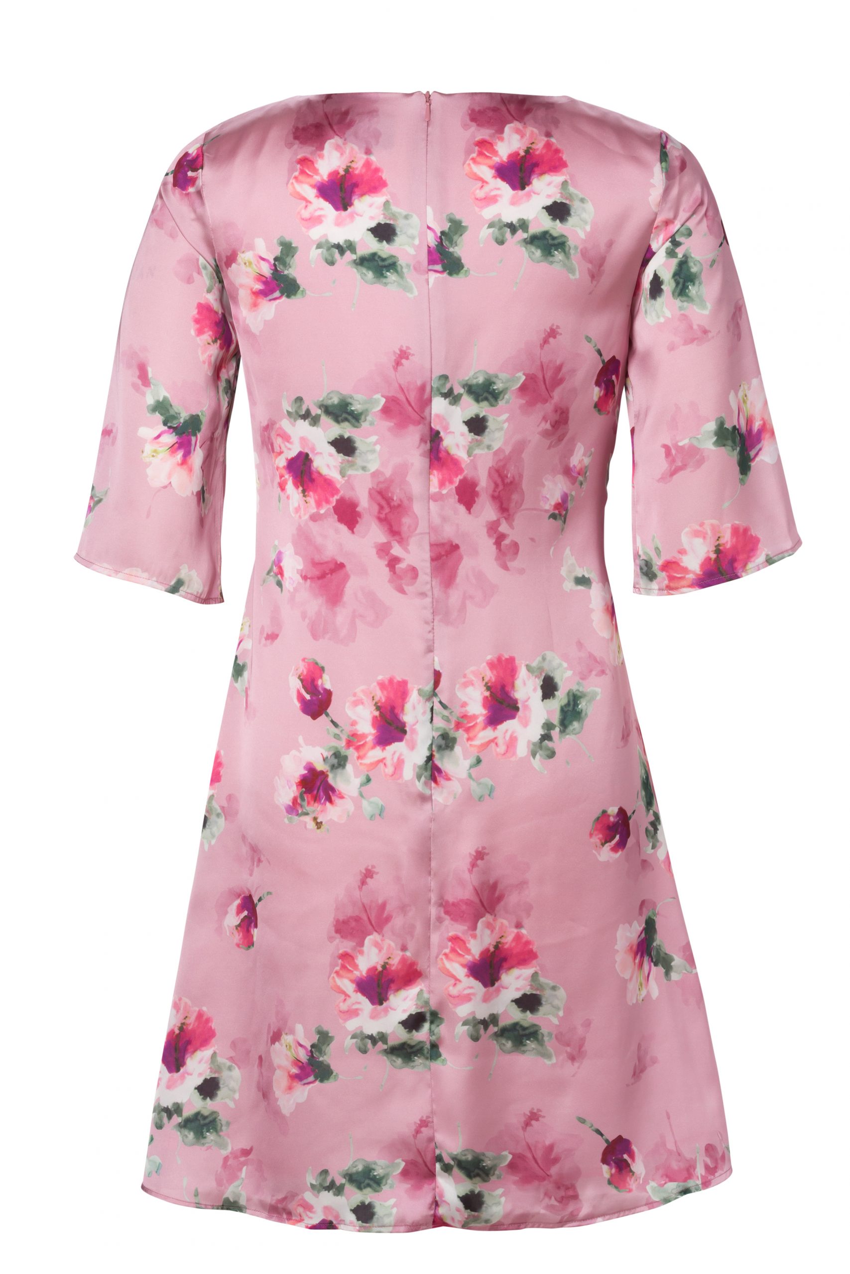 Vår älskade Maja klänning här i vårt egna hibiskus print på en vacker rosa botten. Tillverkad i skimrande Italiensk siden och med ett foder i cupro. Klänningen är a-linjeformad, har båtformad hals och har en lite vidare ärm som slutar vid armbåge. Dragkedja mitt bak och klänningen slutar strax ovan knät (modell 170cm). Klänningen är tillverkad i vår fabrik i Sverige för en hållbar framtid! Titta i vår storleksguide för din rätta storlek.