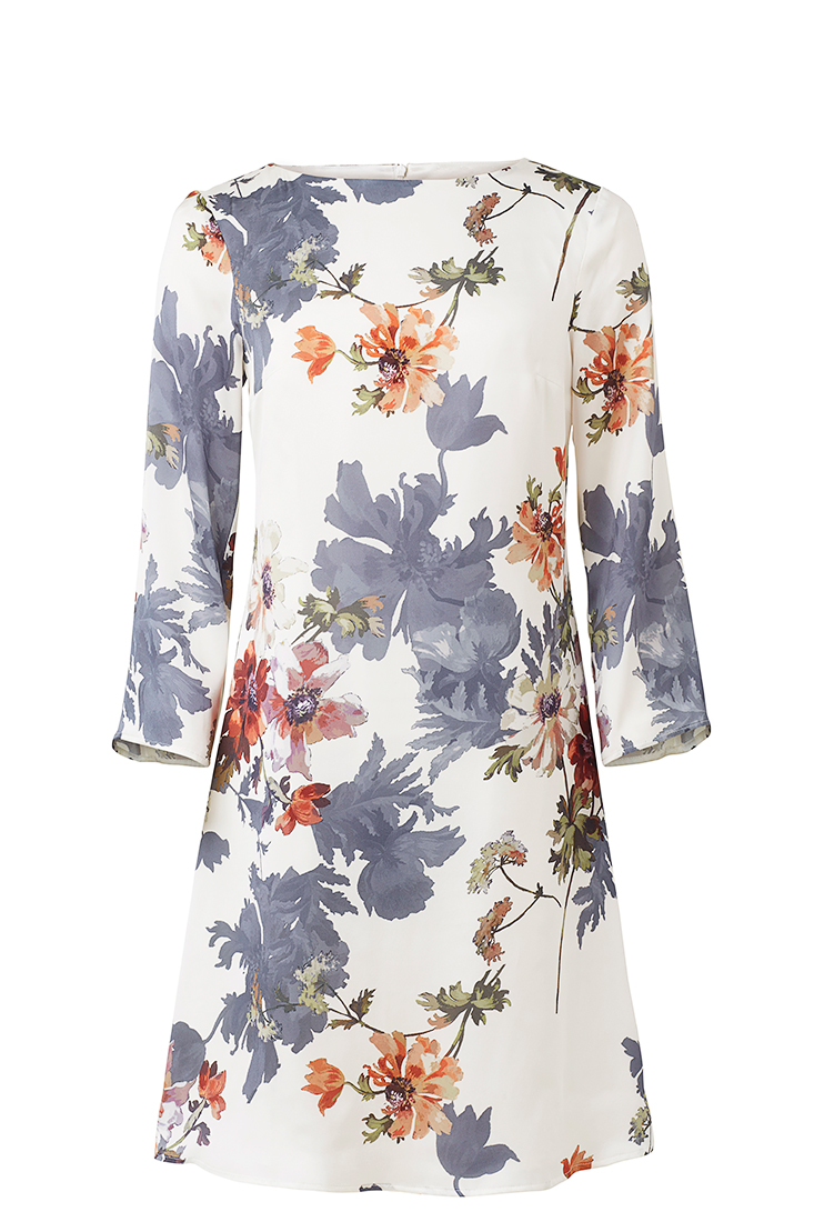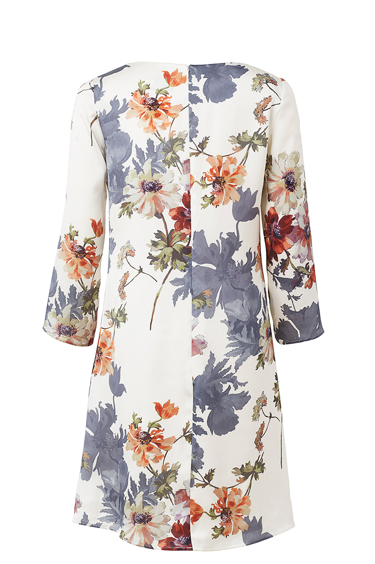 Our classic dress Maja with boat neckline and three-quarter sleeves. Made of the finest Italian silk with a shimmering pearl bottom and beautiful floral print in rust, coral and gray tones. The dress is fully lined and ends just above the knee. Zipper in the middle of the back. A dress for you who want something out of the ordinary. Made in Sweden for a sustainable future!